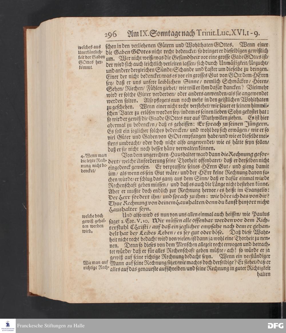 August Hermann Franckens S.Theol.Prof.und Past. Sonn= Fest= und Apostel=Tags=-Predigten / Darinnen Die zum wahren Christenthum gehörige nöthigste und vornehmste Materien abgehandelt sind; Nunmehro von neuen wieder durchgesehen / und mit einigen Predigten vermehret / Nebst den darzu nützlichen Registern. Die vierte EDITION. HALLE / gedruckt und verlegt im Wäysen=Hause / MDCCXV. Mit Königl.Preuß.und Churfl.Brandenb.Privil.