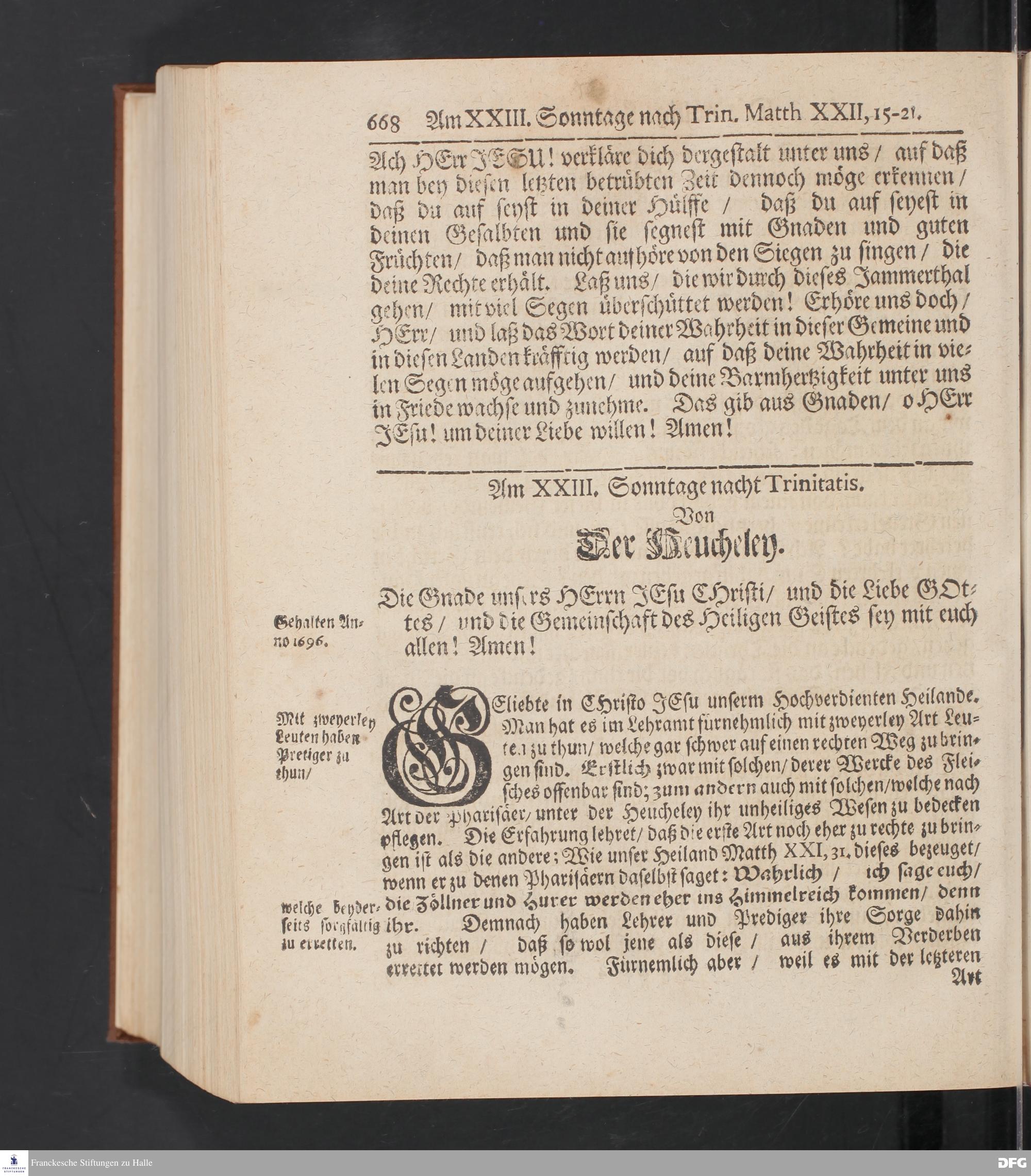 August Hermann Franckens S.Theol.Prof.und Past. Sonn= Fest= und Apostel=Tags=-Predigten / Darinnen Die zum wahren Christenthum gehörige nöthigste und vornehmste Materien abgehandelt sind; Nunmehro von neuen wieder durchgesehen / und mit einigen Predigten vermehret / Nebst den darzu nützlichen Registern. Die vierte EDITION. HALLE / gedruckt und verlegt im Wäysen=Hause / MDCCXV. Mit Königl.Preuß.und Churfl.Brandenb.Privil.
