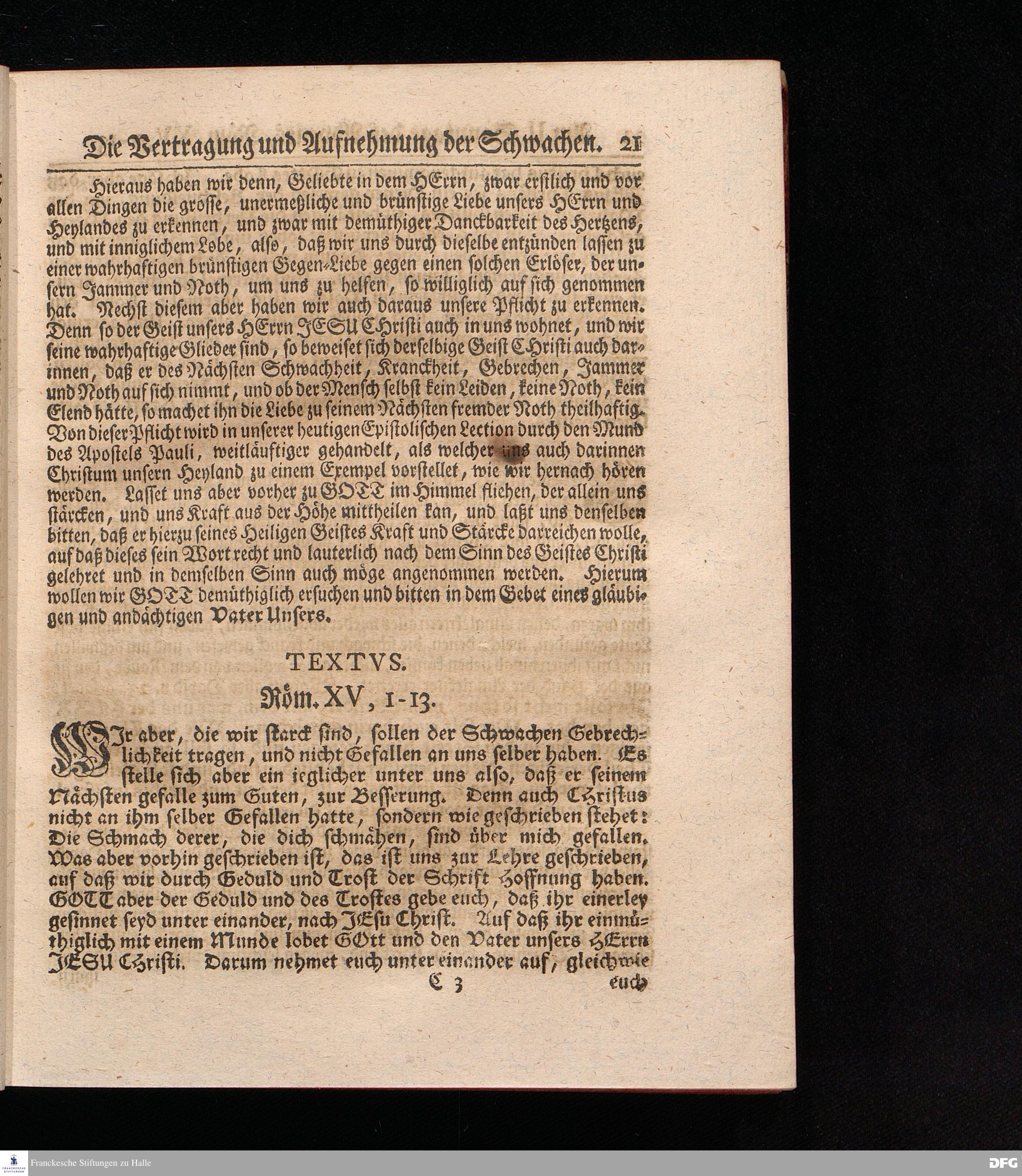August Hermann Franckens, S.Theol.Prof.Past.Ulric.& Scholarchæ Predigten über die Sonn= und Fest=Tags=Episteln / Nebst einer Vorrede vom erbaulichen predigen, und von dem rechten Gebrauch dieser Predigten, auch Mit nöthigen Registern versehen. Die dritte EDITION. HALLE, in Verlegung des Wäysen=Hauses, MDCCXXXXI.