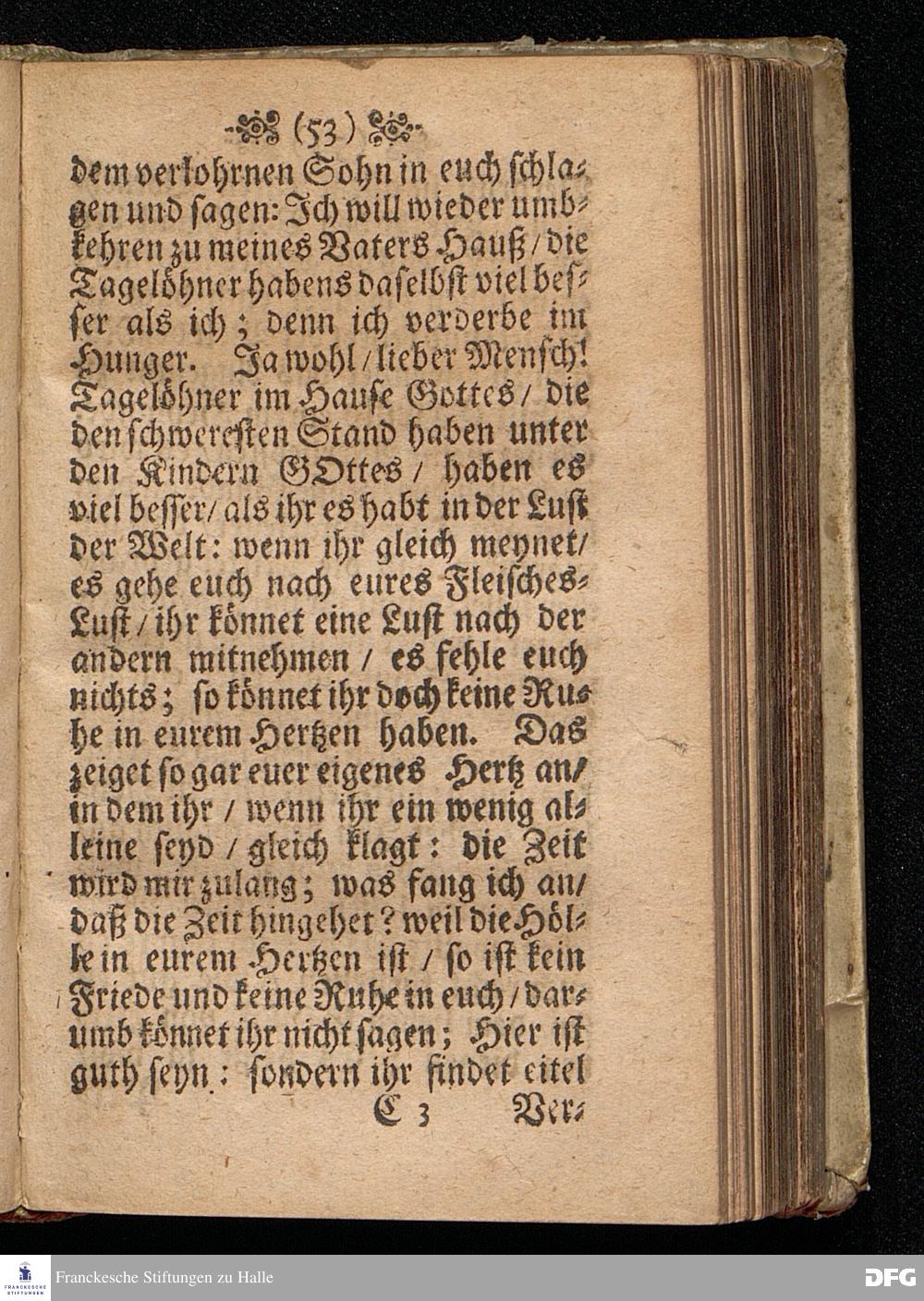 Der Vorschmack des ewigen Lebens / In einer Predigt Uber das Evangelium Matth.XVII, v.1==9, am 6.Sonntag nach Epiphan. Anno 1698, In der St.Georgen=Kirche zu Glaucha an Halle vorgestellet von M.August Hermann Francken / Gr.& OO.LL.P.P.& P.Glauch. HALLE / Gedruckt bey Christian Henckel / Univers.Buchdr.1698.