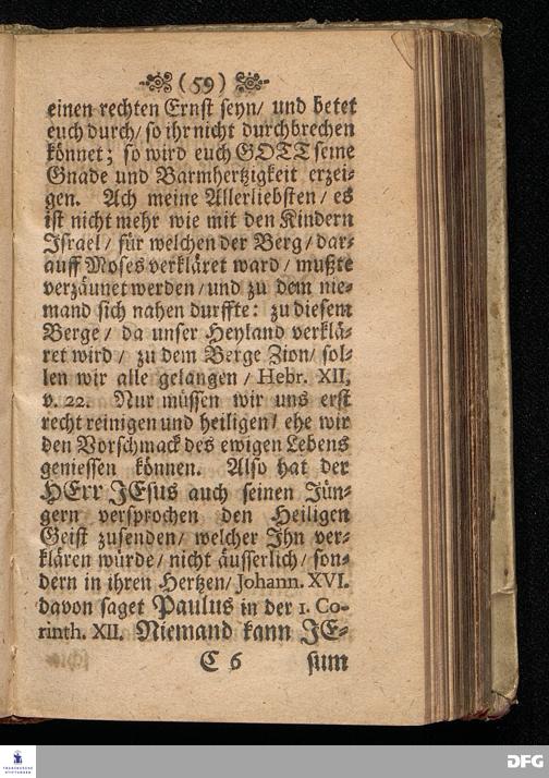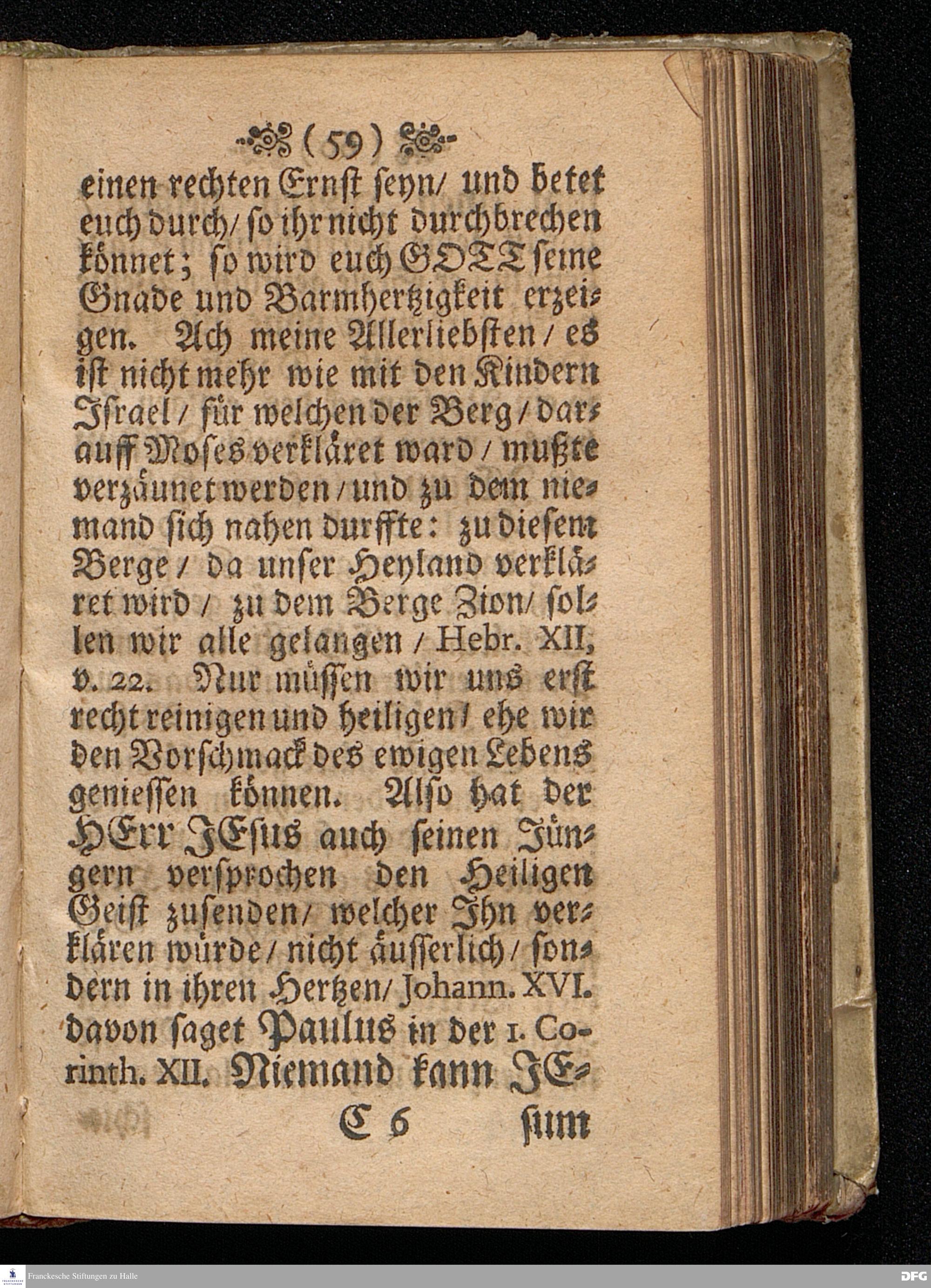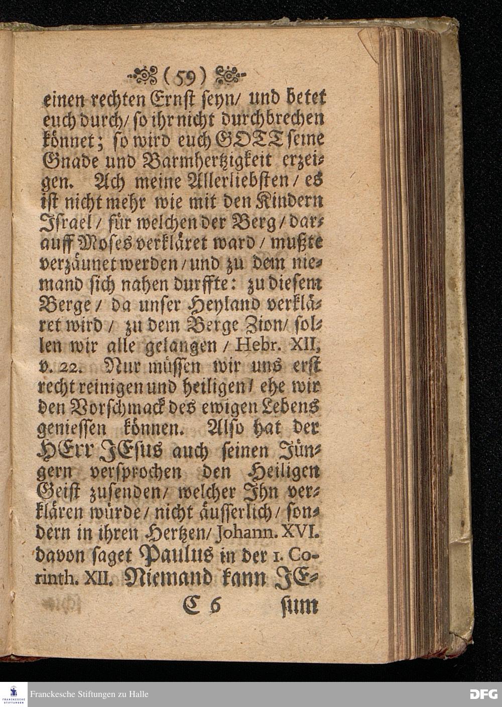 Der Vorschmack des ewigen Lebens / In einer Predigt Uber das Evangelium Matth.XVII, v.1==9, am 6.Sonntag nach Epiphan. Anno 1698, In der St.Georgen=Kirche zu Glaucha an Halle vorgestellet von M.August Hermann Francken / Gr.& OO.LL.P.P.& P.Glauch. HALLE / Gedruckt bey Christian Henckel / Univers.Buchdr.1698.