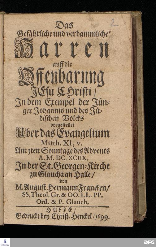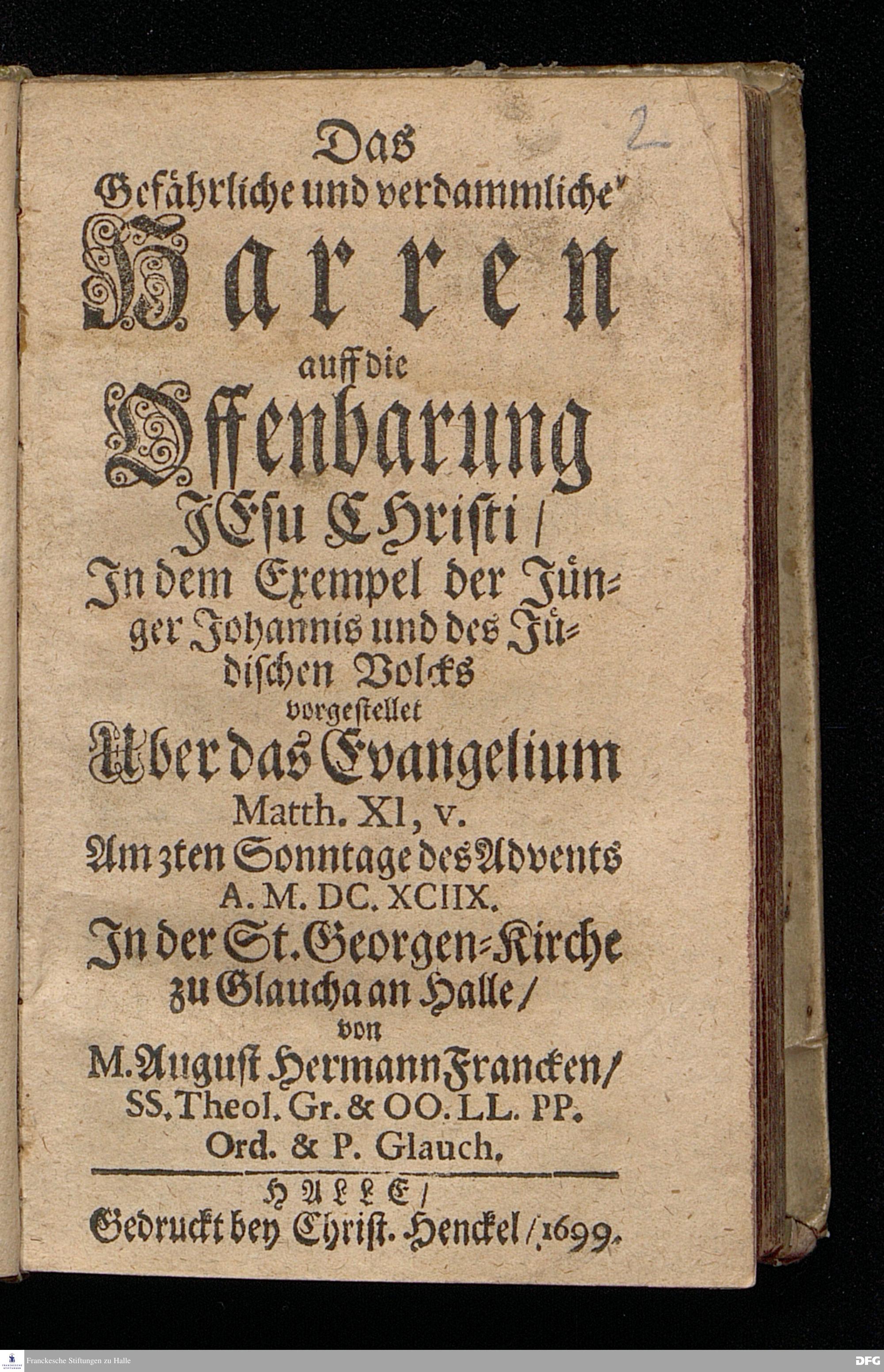 Das Gefährliche und verdammliche Harren auff die Offenbarung JEsu CHristi / In dem Exempel der Jünger Johannis und des Jüdischen Volcks vorgestellet Uber das Evangelium Matth.XI, v.[2-10]. Am 3ten Sonntage des Advents A.M.DC.XCIIX. In der St.Georgen=Kirche zu Glaucha an Halle / von M.August Hermann Francken / SS.Theol.Gr.& OO.LL.PP. Ord.& P.Glauch. HALLE / Gedruckt bey Christ. Henckel / 1699.
