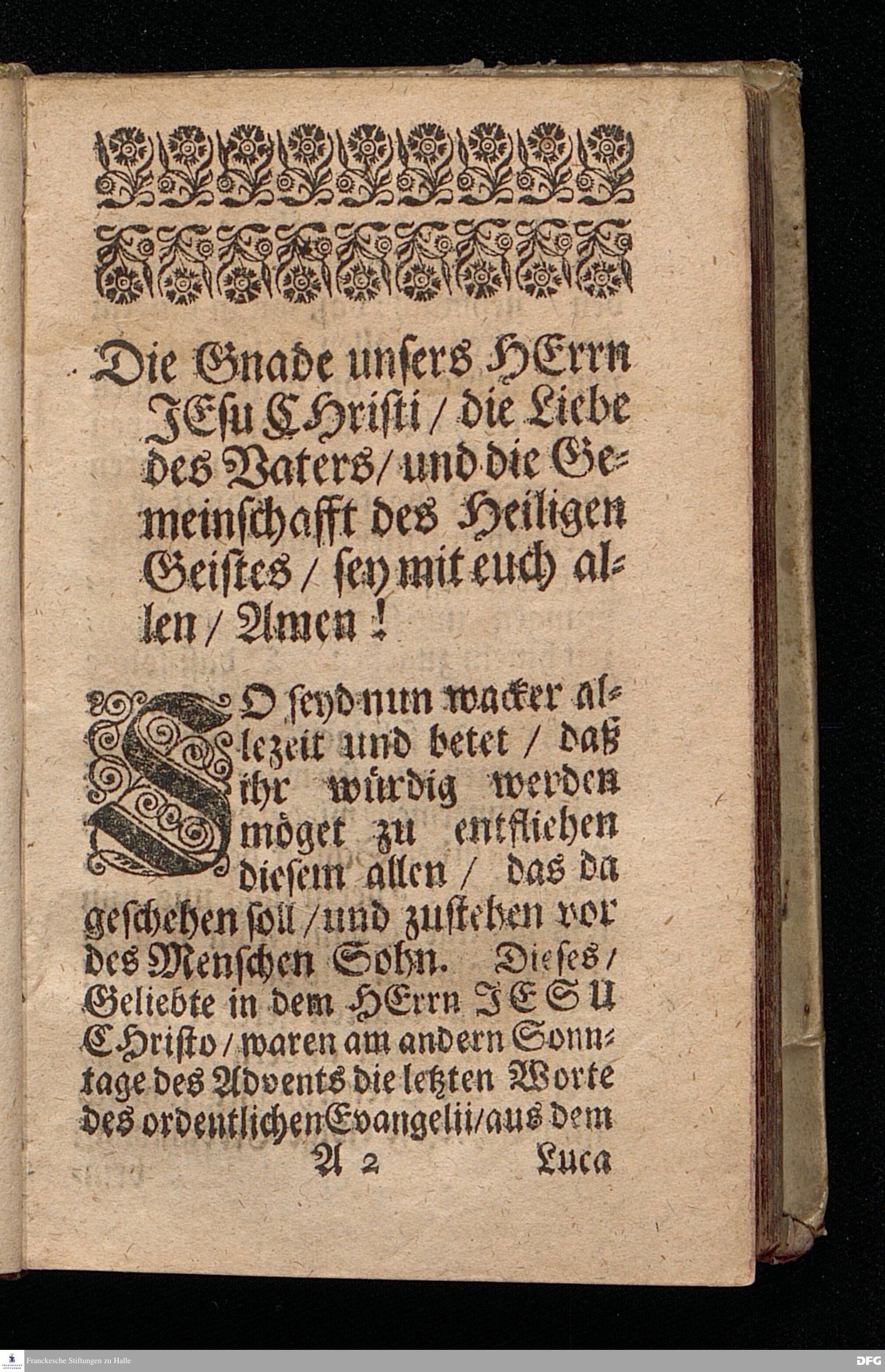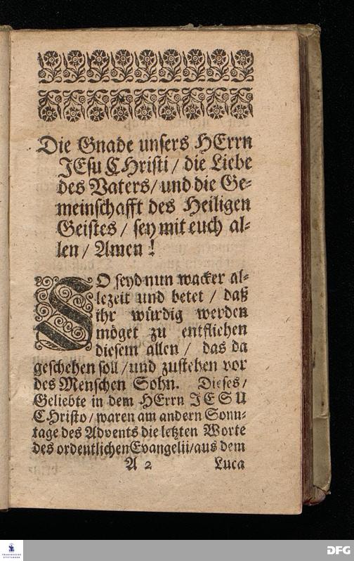 Das Gefährliche und verdammliche Harren auff die Offenbarung JEsu CHristi / In dem Exempel der Jünger Johannis und des Jüdischen Volcks vorgestellet Uber das Evangelium Matth.XI, v.[2-10]. Am 3ten Sonntage des Advents A.M.DC.XCIIX. In der St.Georgen=Kirche zu Glaucha an Halle / von M.August Hermann Francken / SS.Theol.Gr.& OO.LL.PP. Ord.& P.Glauch. HALLE / Gedruckt bey Christ. Henckel / 1699.