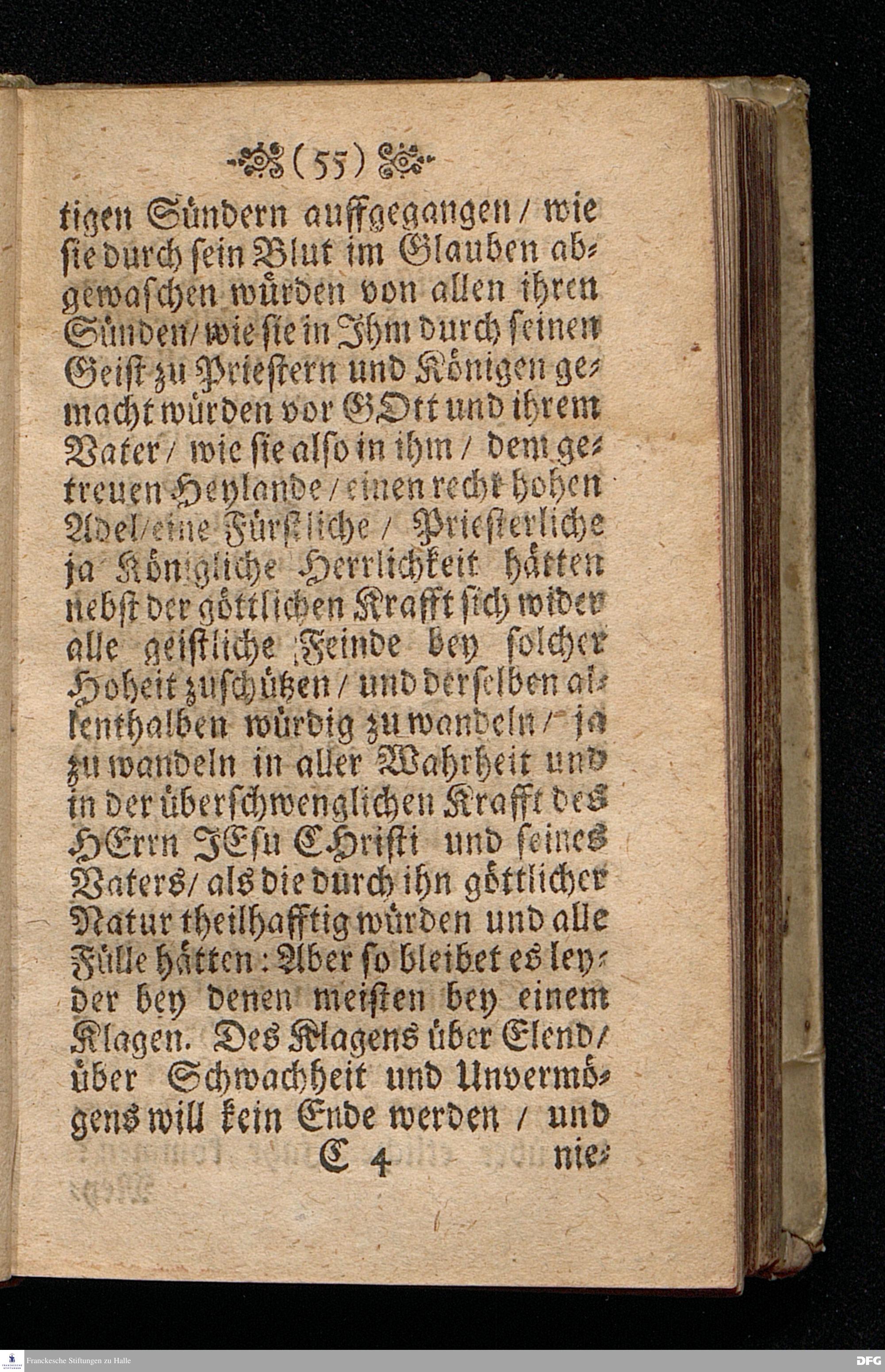 Das Gefährliche und verdammliche Harren auff die Offenbarung JEsu CHristi / In dem Exempel der Jünger Johannis und des Jüdischen Volcks vorgestellet Uber das Evangelium Matth.XI, v.[2-10]. Am 3ten Sonntage des Advents A.M.DC.XCIIX. In der St.Georgen=Kirche zu Glaucha an Halle / von M.August Hermann Francken / SS.Theol.Gr.& OO.LL.PP. Ord.& P.Glauch. HALLE / Gedruckt bey Christ. Henckel / 1699.