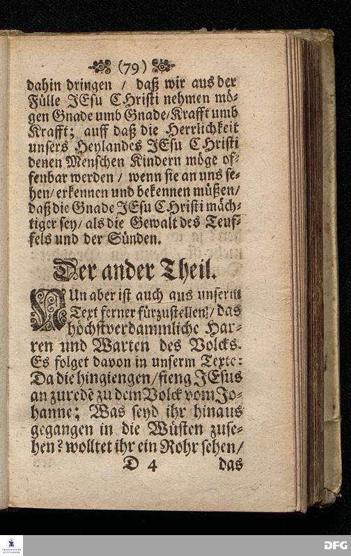 Das Gefährliche und verdammliche Harren auff die Offenbarung JEsu CHristi / In dem Exempel der Jünger Johannis und des Jüdischen Volcks vorgestellet Uber das Evangelium Matth.XI, v.[2-10]. Am 3ten Sonntage des Advents A.M.DC.XCIIX. In der St.Georgen=Kirche zu Glaucha an Halle / von M.August Hermann Francken / SS.Theol.Gr.& OO.LL.PP. Ord.& P.Glauch. HALLE / Gedruckt bey Christ. Henckel / 1699.