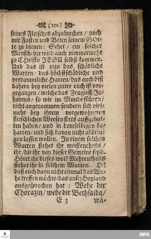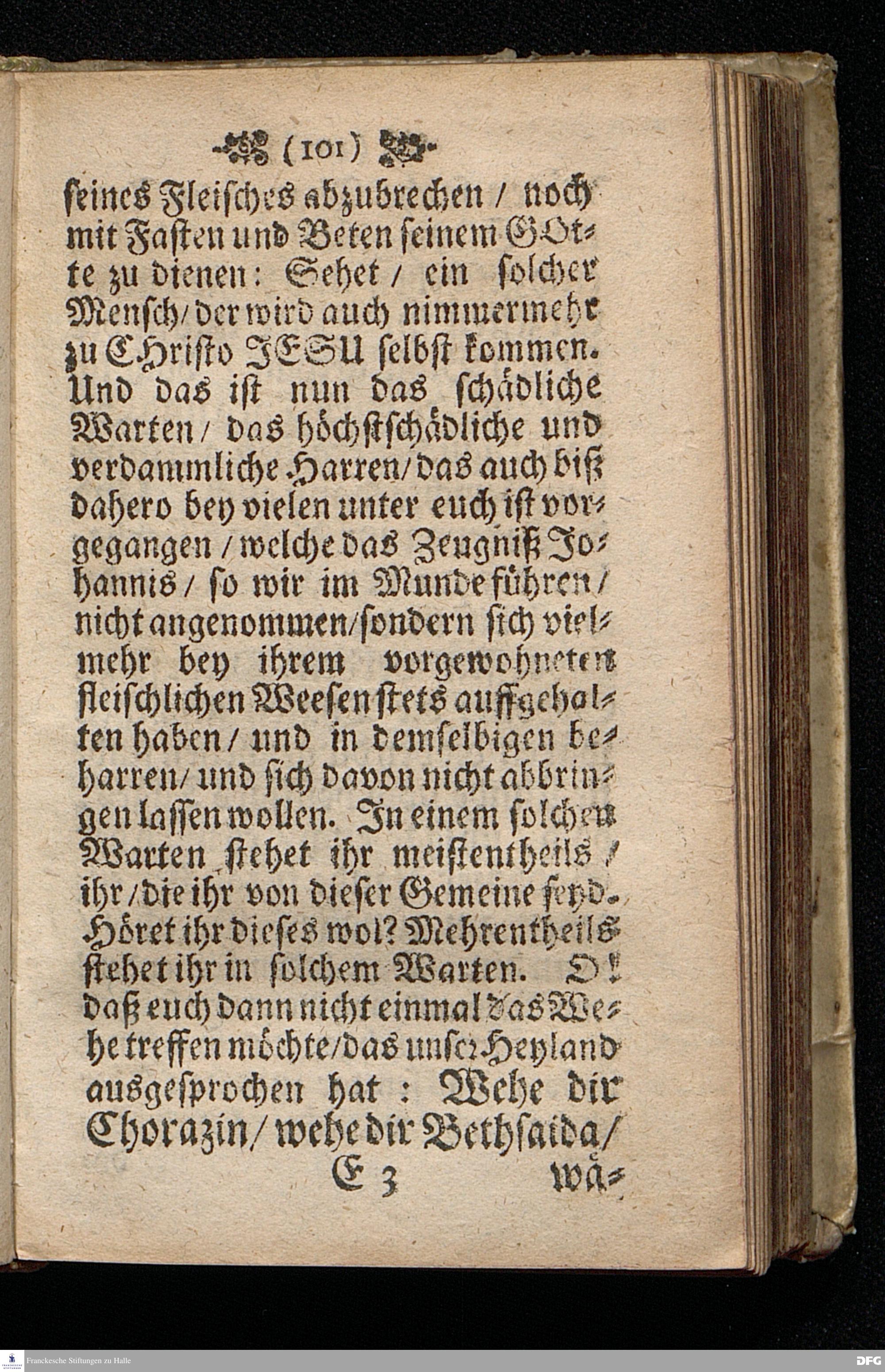 Das Gefährliche und verdammliche Harren auff die Offenbarung JEsu CHristi / In dem Exempel der Jünger Johannis und des Jüdischen Volcks vorgestellet Uber das Evangelium Matth.XI, v.[2-10]. Am 3ten Sonntage des Advents A.M.DC.XCIIX. In der St.Georgen=Kirche zu Glaucha an Halle / von M.August Hermann Francken / SS.Theol.Gr.& OO.LL.PP. Ord.& P.Glauch. HALLE / Gedruckt bey Christ. Henckel / 1699.