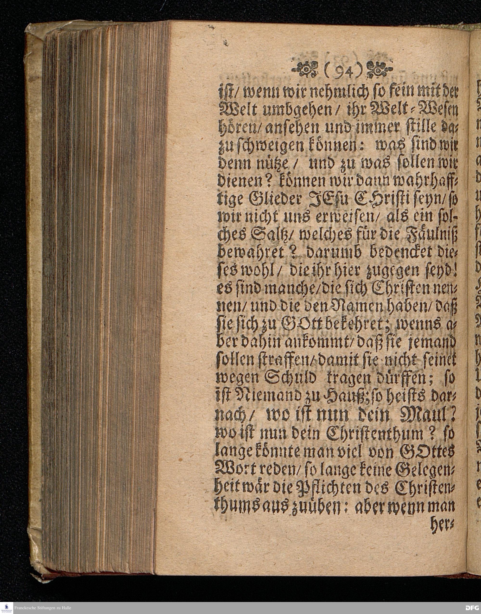 Der Sinn Christi Am XVII.Sonntag nach Trinit. ANNO 1698. In einer Predigt Uber das Evangelium Luc.XIV, vers.1==11. In der St.Georgen=Kirche zu Glaucha an Halle vorgestellet / von M.August Hermann Francken / SS.Theol.Gr.& OO.LL.P.P.Ord.& P.Glauch. HALLE / Gedruckt bey Christian Henckeln / Univers.Buchdr. 1699.