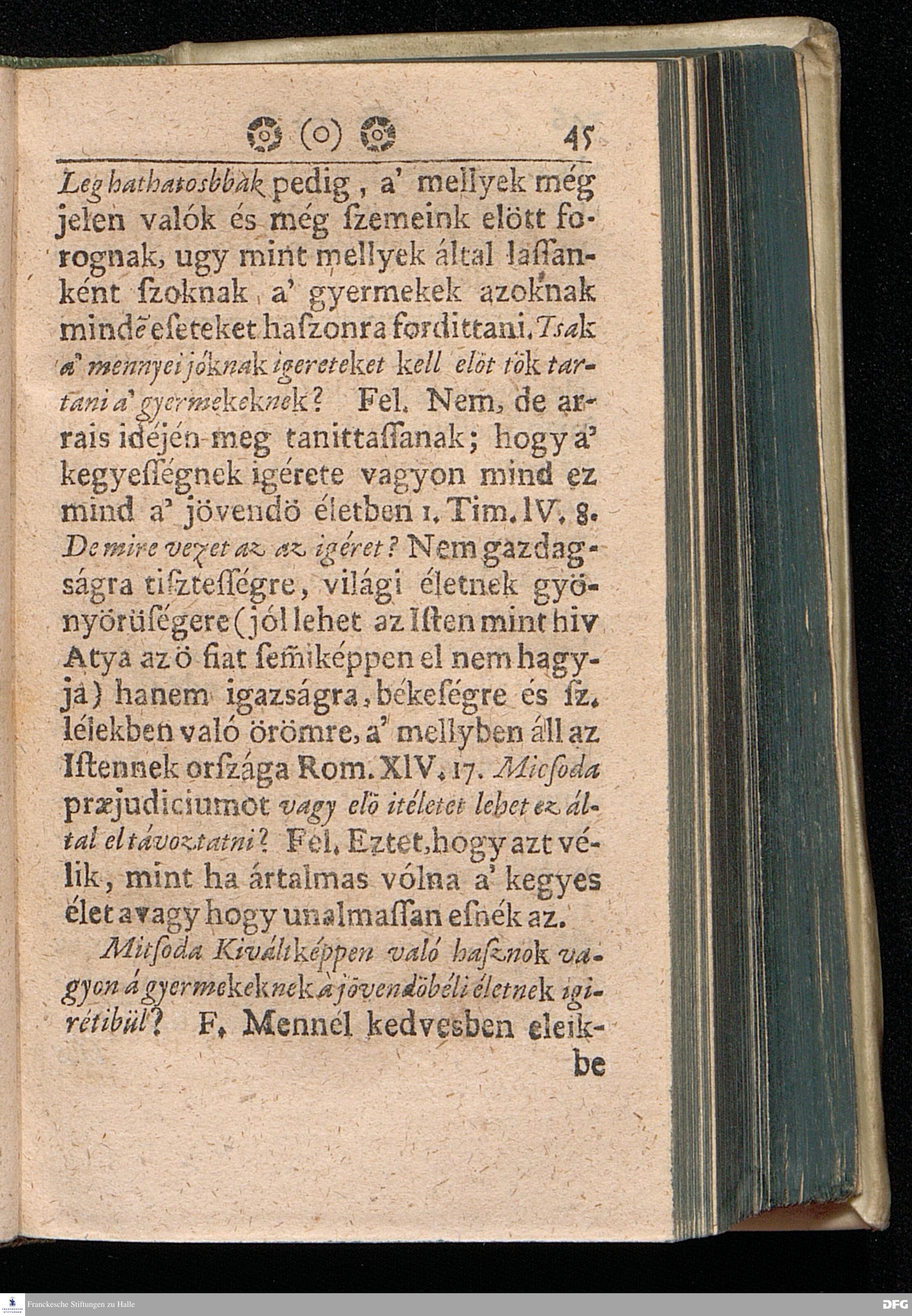 Augustus Herman. Franckenak, Sz. Ir. Prof. és Predikatornak Oktatása A© GYERMEK NEVELE'SRüL Az igaz Isteni félelemre és kegyességre Mint vitessenek à kis Gyermekek; Köz beszélgetésbe foglaltatott Virth Ambrus Norimb. Predik. által, most penig szükséges voltáert és à közönséges haszonért kerdésekbe foglalva Magyar nyelvre fordétratott: Melly munkával minden valláson lévök alkalmassan élhetnek, mert itt à hit dolgárul nem disputáltatik, hanem Kiváltképpen à kegyes SZÜLE©KNEK és à hiv PRAECEPTOROKNAK jó és kegyes tanáts adatik mint viseljék magokat jó lelki esmérettel à gyermekek kor¯ul, bog y az ö tisztekben az Istennek büvéges aldását várhassák magokra. Nyomtattatott Hallában Orbán István által. 1711