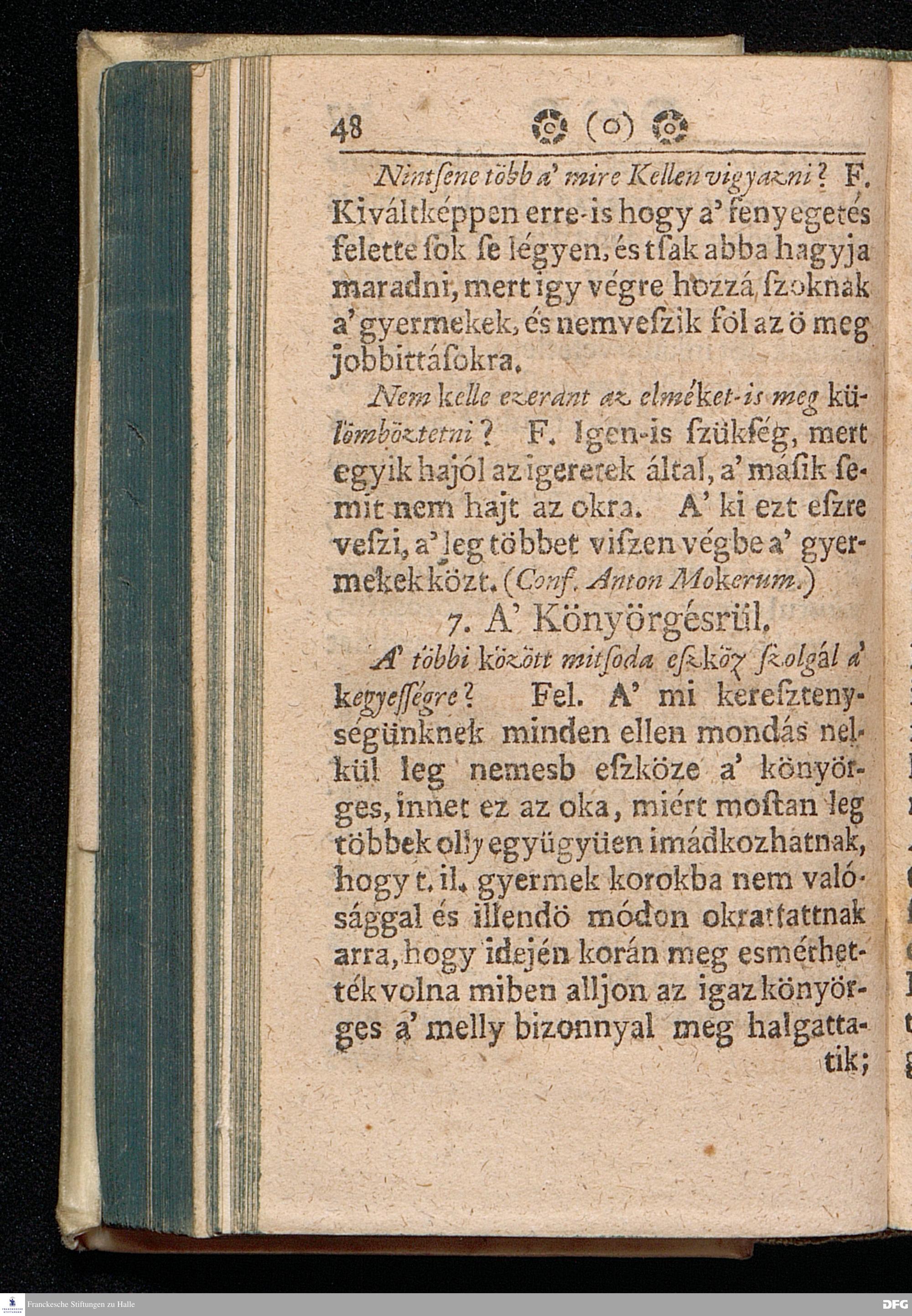 Augustus Herman. Franckenak, Sz. Ir. Prof. és Predikatornak Oktatása A© GYERMEK NEVELE'SRüL Az igaz Isteni félelemre és kegyességre Mint vitessenek à kis Gyermekek; Köz beszélgetésbe foglaltatott Virth Ambrus Norimb. Predik. által, most penig szükséges voltáert és à közönséges haszonért kerdésekbe foglalva Magyar nyelvre fordétratott: Melly munkával minden valláson lévök alkalmassan élhetnek, mert itt à hit dolgárul nem disputáltatik, hanem Kiváltképpen à kegyes SZÜLE©KNEK és à hiv PRAECEPTOROKNAK jó és kegyes tanáts adatik mint viseljék magokat jó lelki esmérettel à gyermekek kor¯ul, bog y az ö tisztekben az Istennek büvéges aldását várhassák magokra. Nyomtattatott Hallában Orbán István által. 1711