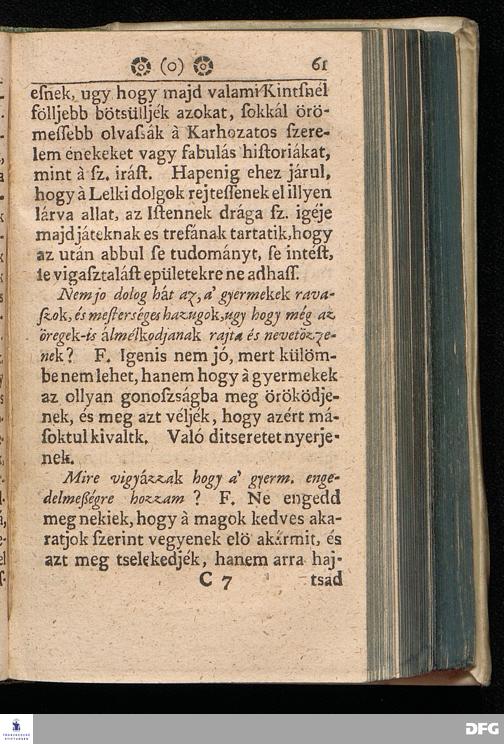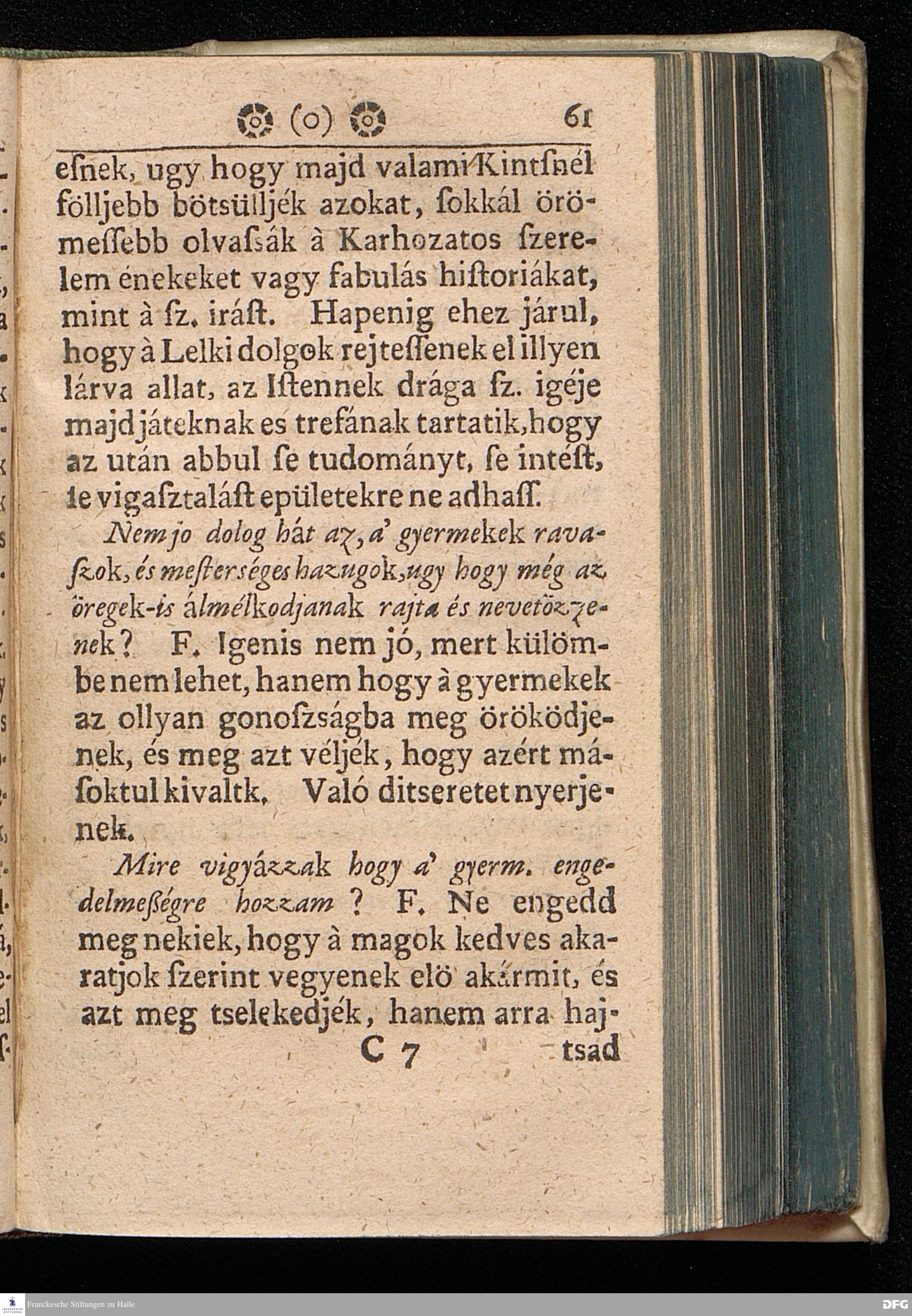 Augustus Herman. Franckenak, Sz. Ir. Prof. és Predikatornak Oktatása A© GYERMEK NEVELE'SRüL Az igaz Isteni félelemre és kegyességre Mint vitessenek à kis Gyermekek; Köz beszélgetésbe foglaltatott Virth Ambrus Norimb. Predik. által, most penig szükséges voltáert és à közönséges haszonért kerdésekbe foglalva Magyar nyelvre fordétratott: Melly munkával minden valláson lévök alkalmassan élhetnek, mert itt à hit dolgárul nem disputáltatik, hanem Kiváltképpen à kegyes SZÜLE©KNEK és à hiv PRAECEPTOROKNAK jó és kegyes tanáts adatik mint viseljék magokat jó lelki esmérettel à gyermekek kor¯ul, bog y az ö tisztekben az Istennek büvéges aldását várhassák magokra. Nyomtattatott Hallában Orbán István által. 1711