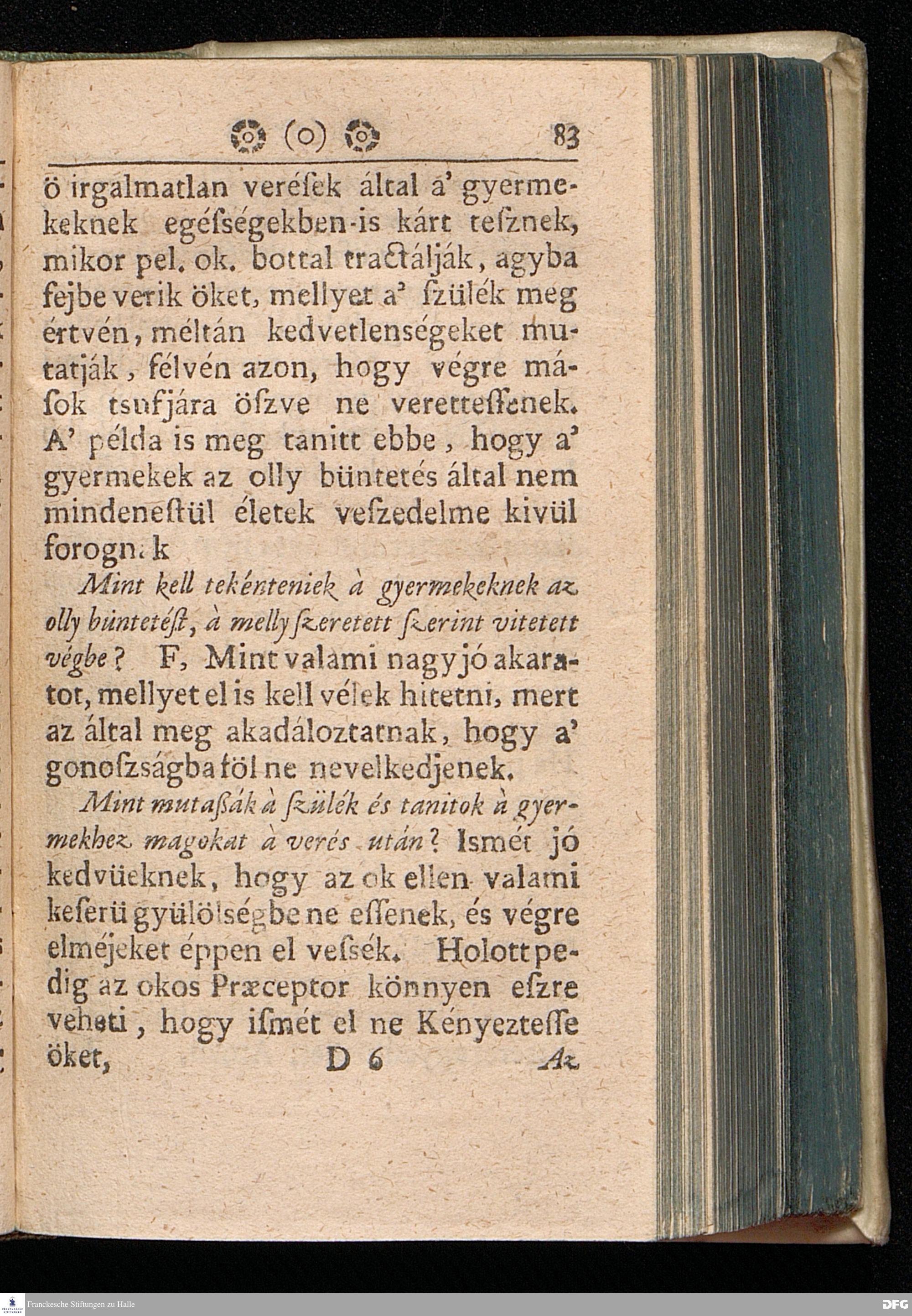 Augustus Herman. Franckenak, Sz. Ir. Prof. és Predikatornak Oktatása A© GYERMEK NEVELE'SRüL Az igaz Isteni félelemre és kegyességre Mint vitessenek à kis Gyermekek; Köz beszélgetésbe foglaltatott Virth Ambrus Norimb. Predik. által, most penig szükséges voltáert és à közönséges haszonért kerdésekbe foglalva Magyar nyelvre fordétratott: Melly munkával minden valláson lévök alkalmassan élhetnek, mert itt à hit dolgárul nem disputáltatik, hanem Kiváltképpen à kegyes SZÜLE©KNEK és à hiv PRAECEPTOROKNAK jó és kegyes tanáts adatik mint viseljék magokat jó lelki esmérettel à gyermekek kor¯ul, bog y az ö tisztekben az Istennek büvéges aldását várhassák magokra. Nyomtattatott Hallában Orbán István által. 1711