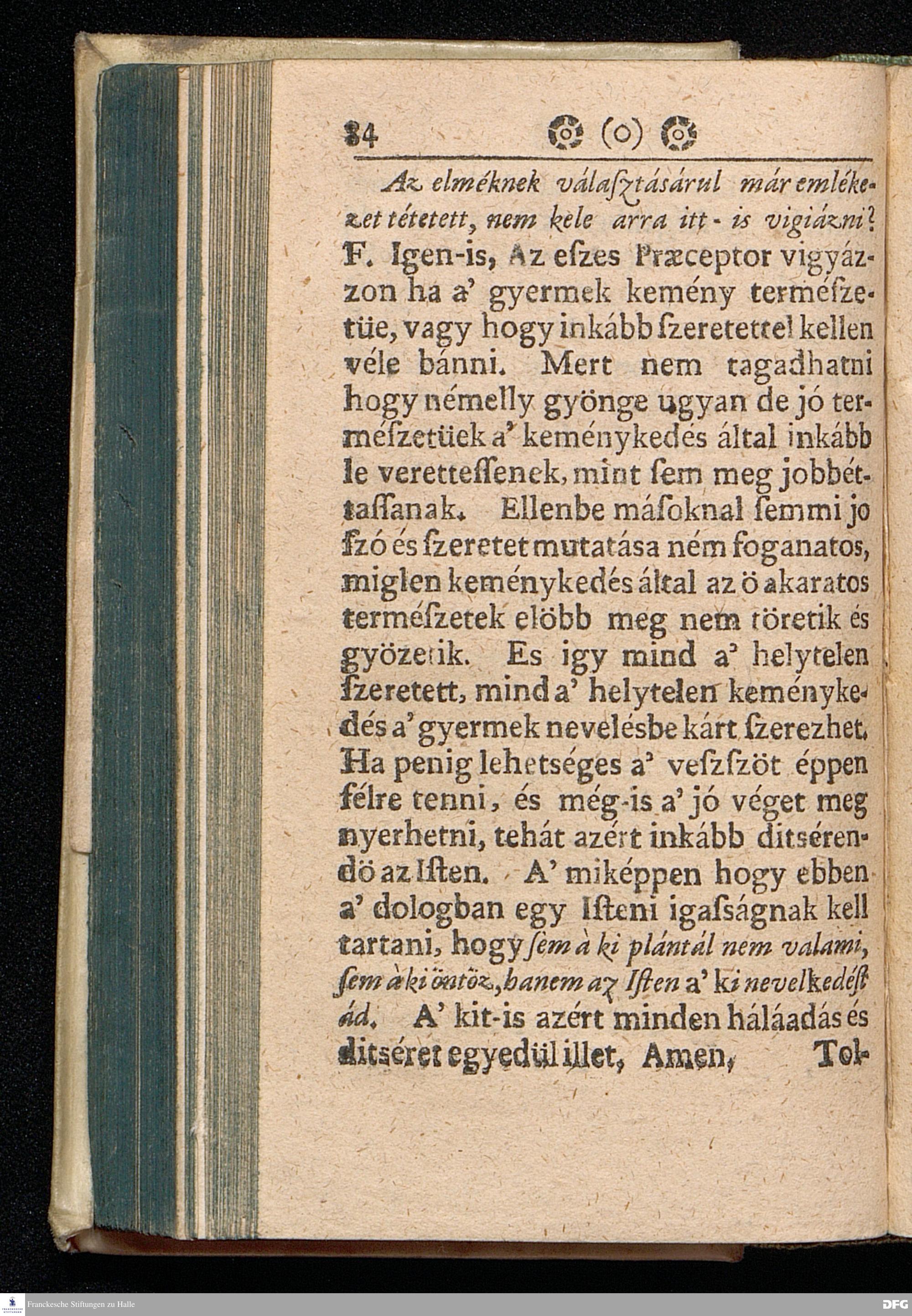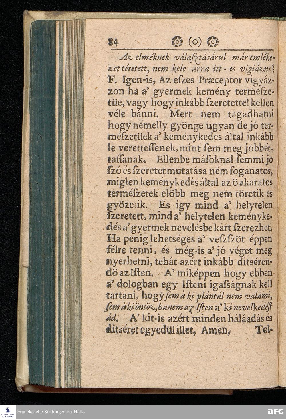 Augustus Herman. Franckenak, Sz. Ir. Prof. és Predikatornak Oktatása A© GYERMEK NEVELE'SRüL Az igaz Isteni félelemre és kegyességre Mint vitessenek à kis Gyermekek; Köz beszélgetésbe foglaltatott Virth Ambrus Norimb. Predik. által, most penig szükséges voltáert és à közönséges haszonért kerdésekbe foglalva Magyar nyelvre fordétratott: Melly munkával minden valláson lévök alkalmassan élhetnek, mert itt à hit dolgárul nem disputáltatik, hanem Kiváltképpen à kegyes SZÜLE©KNEK és à hiv PRAECEPTOROKNAK jó és kegyes tanáts adatik mint viseljék magokat jó lelki esmérettel à gyermekek kor¯ul, bog y az ö tisztekben az Istennek büvéges aldását várhassák magokra. Nyomtattatott Hallában Orbán István által. 1711