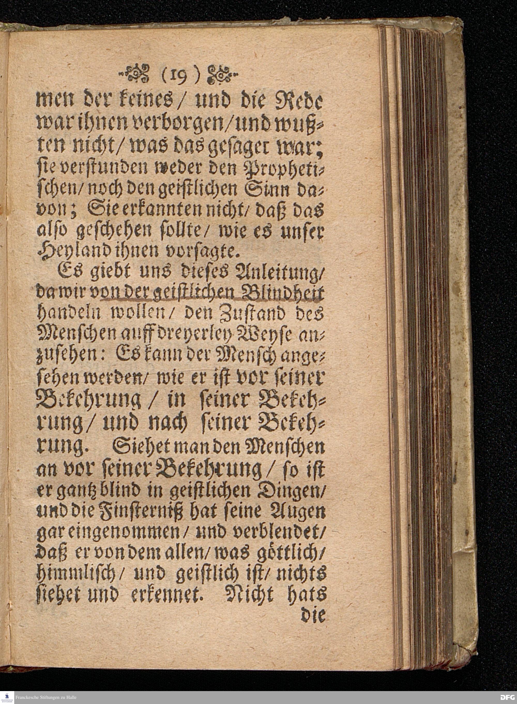 Die Lehre von der Erleuchtung / In einer Predigt Uber das Evangelium Luc.XVIII, v.31==43, am Sonntag nach[!] Quinquagesimæ Anno 1698, In der St.Georgen=Kirche zu Glaucha an Halle vorgestellet von M.August Hermann Francken / Gr.& OO.LL.P.P.& P.Glauch. HALLE / Gedruckt bey Christian Henckel / Univers.Buchdr. 1698.