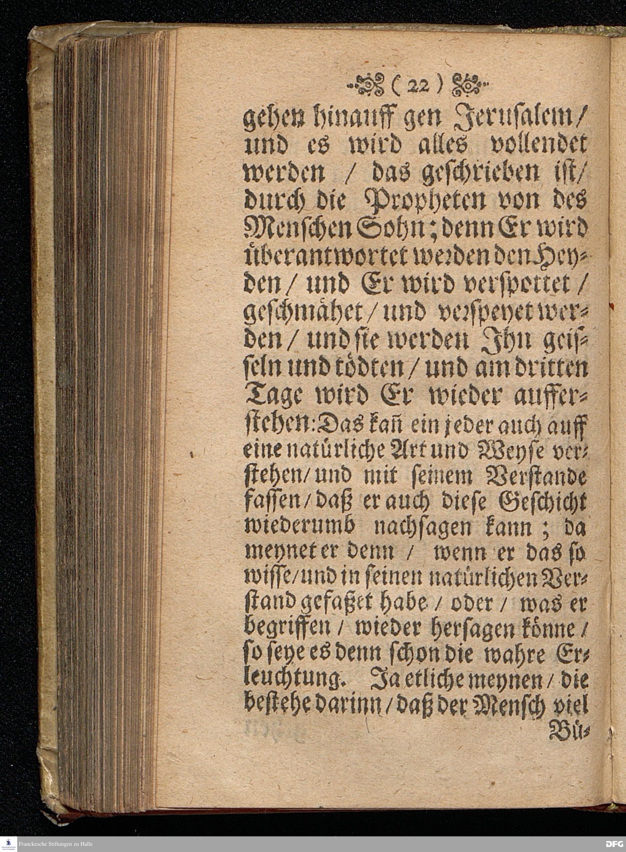Die Lehre von der Erleuchtung / In einer Predigt Uber das Evangelium Luc.XVIII, v.31==43, am Sonntag nach[!] Quinquagesimæ Anno 1698, In der St.Georgen=Kirche zu Glaucha an Halle vorgestellet von M.August Hermann Francken / Gr.& OO.LL.P.P.& P.Glauch. HALLE / Gedruckt bey Christian Henckel / Univers.Buchdr. 1698.