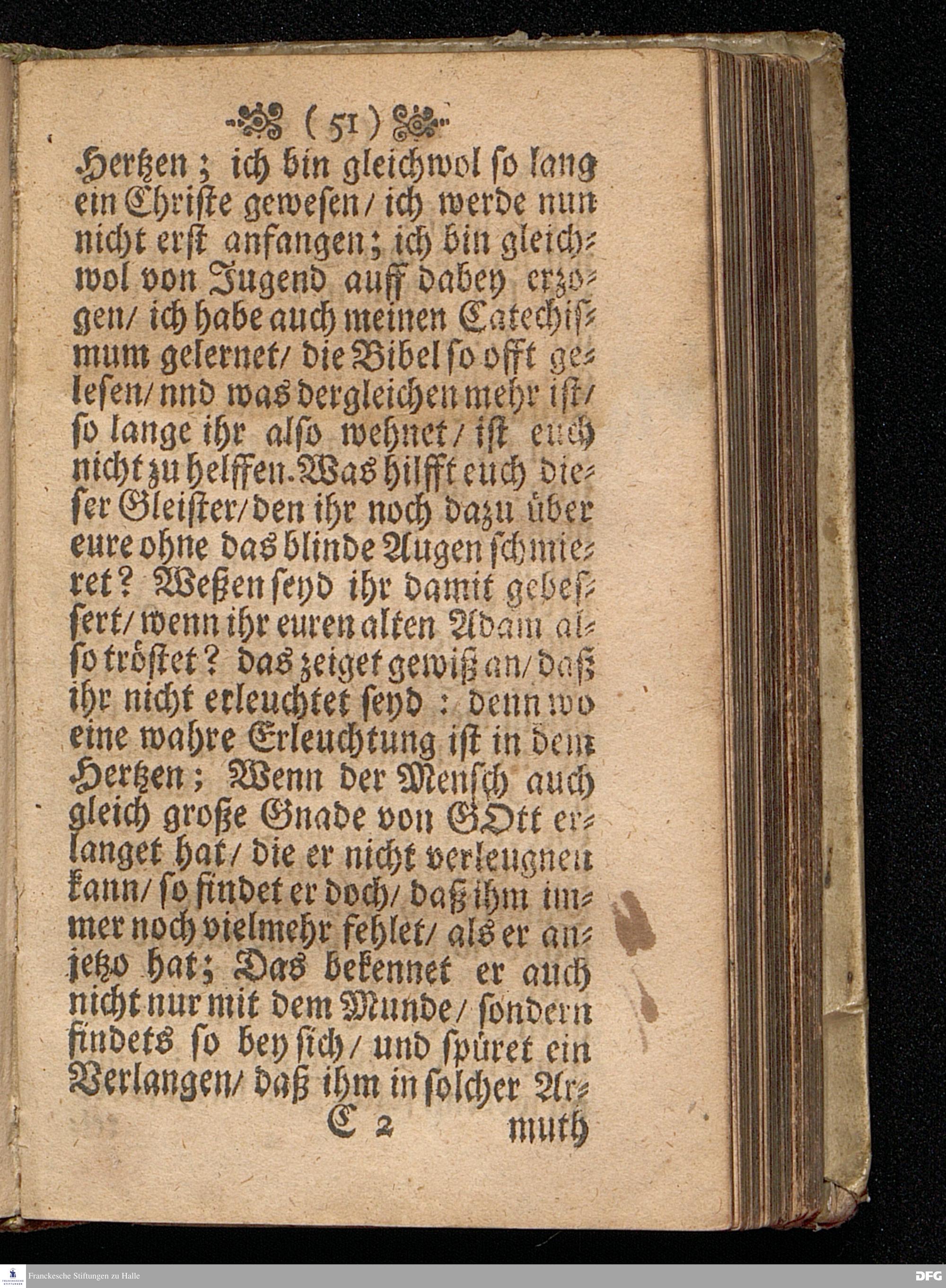 Die Lehre von der Erleuchtung / In einer Predigt Uber das Evangelium Luc.XVIII, v.31==43, am Sonntag nach[!] Quinquagesimæ Anno 1698, In der St.Georgen=Kirche zu Glaucha an Halle vorgestellet von M.August Hermann Francken / Gr.& OO.LL.P.P.& P.Glauch. HALLE / Gedruckt bey Christian Henckel / Univers.Buchdr. 1698.