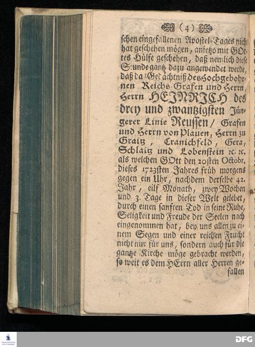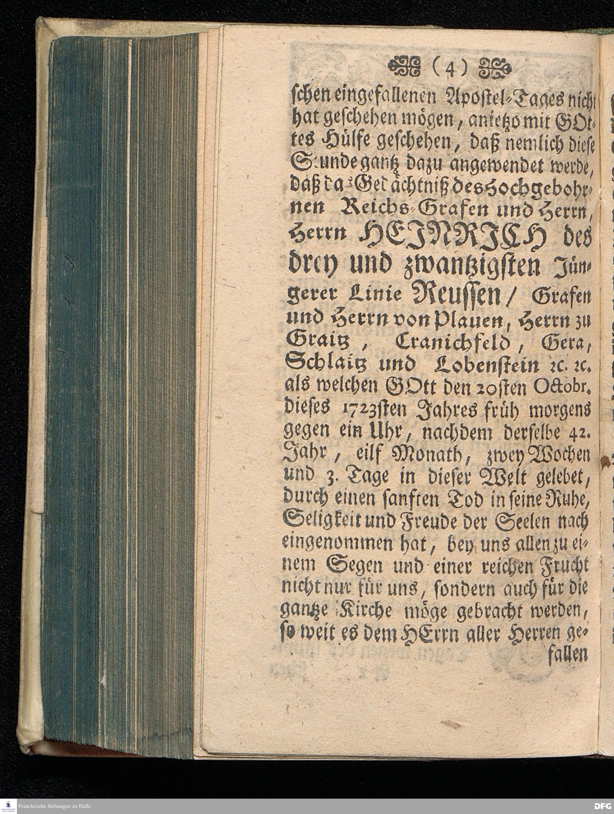 Lobwürdiges Exempel Des Weyland Hochgebohrnen Reichs=Grafen und Herrn HERRN Heinrich des XXIII. Jüngerer Linie Reussen / Grafen und Herrn von Plauen, Herrn zu Graitz, Cranichfeld, Gera, Schlaitz und Lobenstein )(. In einer Parænetischen Lection im öffentlichen Auditorio denen Studiosis Theologiæ vorgestellet und nebst einigen erbaulichen Beylagen herausgegeben von August Hermann Francken / S.Th.Prof.Past.Vlric.& Scholarcha. Der Jugend in den Schulen des Waysen=Hauses nach gehaltenem Examine ausgetheilet d. 24.Dec.1723. HALLE In Verlegung des Wäysenhauses MDCCXXIII.