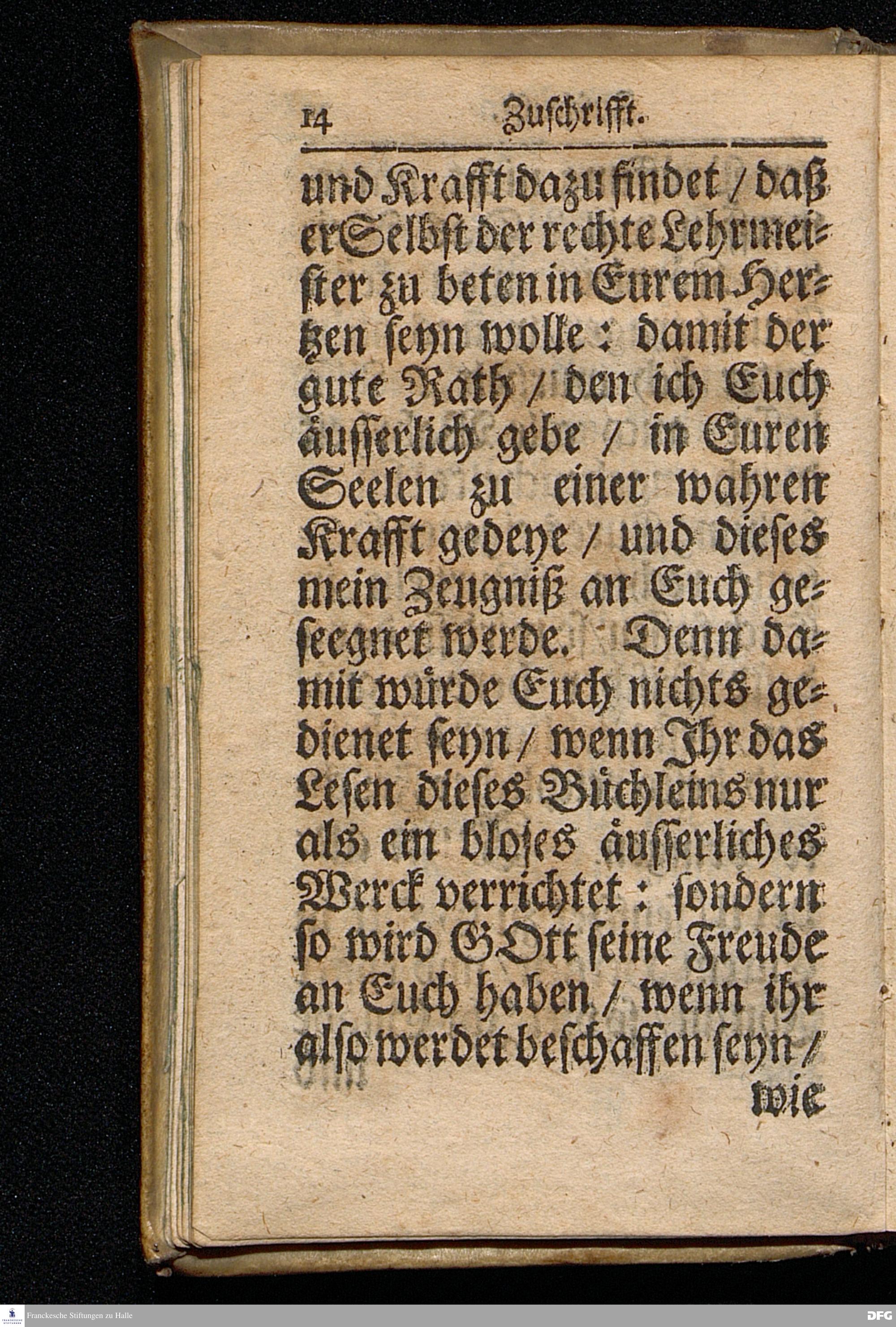 Aug.Herm.Franckens / S.S.Theol.P.Ord.& Past.Glauch. Schrifftmäßige Anweisung Recht und GOTT wohlgefällig Zu Beten / Nebst Einer Anfrage An die Hochlöbl.Theol.Facult. Zu KIEL Und deren RESPONSO, Die Gewißheit und Versicherung der Erhörung des Gebets betreffend. Andere EDITION. CUM PRIVILEGIO. HALLE /Gedruckt und verlegt im Wäysen=Hause. 1703.