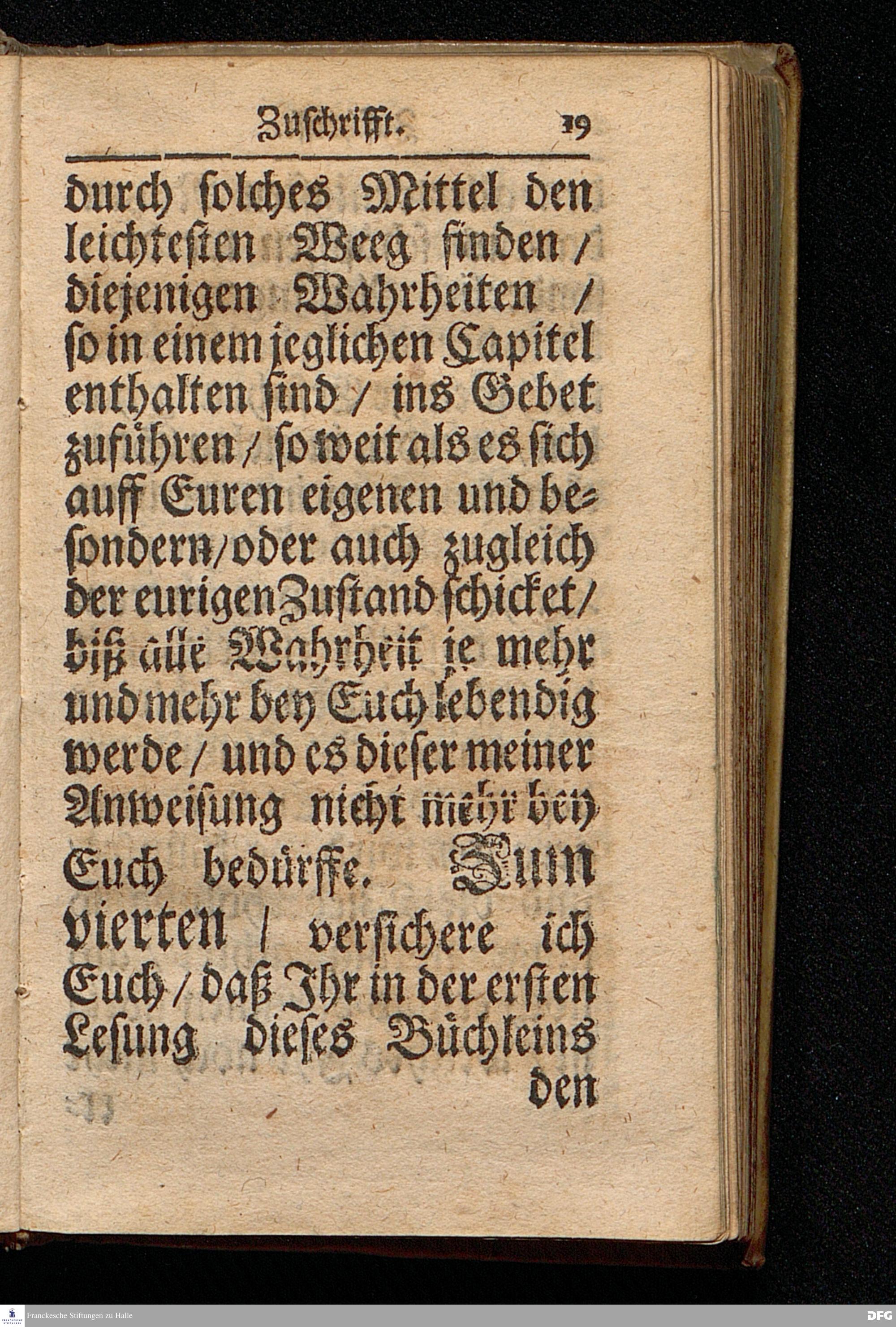 Aug.Herm.Franckens / S.S.Theol.P.Ord.& Past.Glauch. Schrifftmäßige Anweisung Recht und GOTT wohlgefällig Zu Beten / Nebst Einer Anfrage An die Hochlöbl.Theol.Facult. Zu KIEL Und deren RESPONSO, Die Gewißheit und Versicherung der Erhörung des Gebets betreffend. Andere EDITION. CUM PRIVILEGIO. HALLE /Gedruckt und verlegt im Wäysen=Hause. 1703.