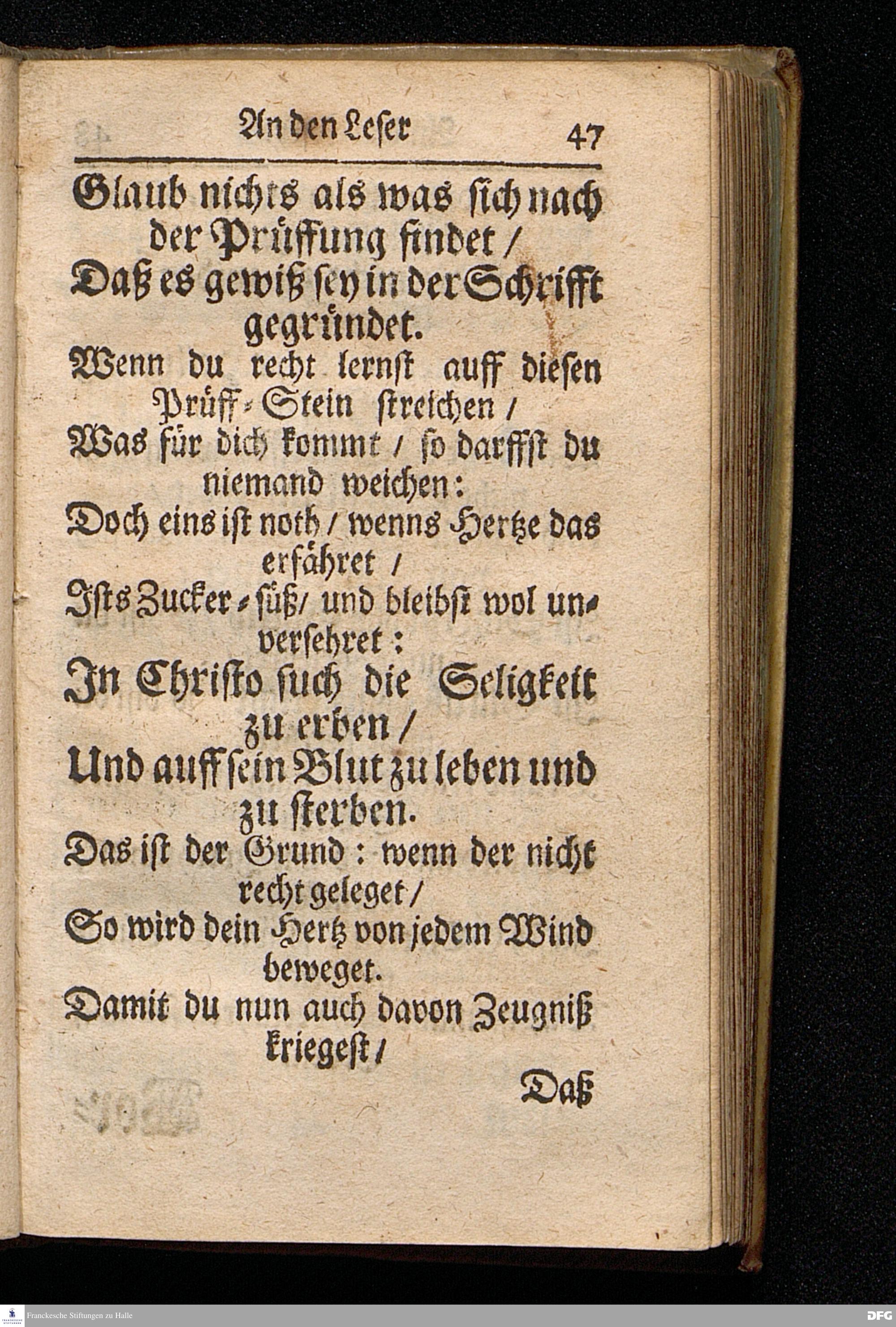 Aug.Herm.Franckens / S.S.Theol.P.Ord.& Past.Glauch. Schrifftmäßige Anweisung Recht und GOTT wohlgefällig Zu Beten / Nebst Einer Anfrage An die Hochlöbl.Theol.Facult. Zu KIEL Und deren RESPONSO, Die Gewißheit und Versicherung der Erhörung des Gebets betreffend. Andere EDITION. CUM PRIVILEGIO. HALLE /Gedruckt und verlegt im Wäysen=Hause. 1703.