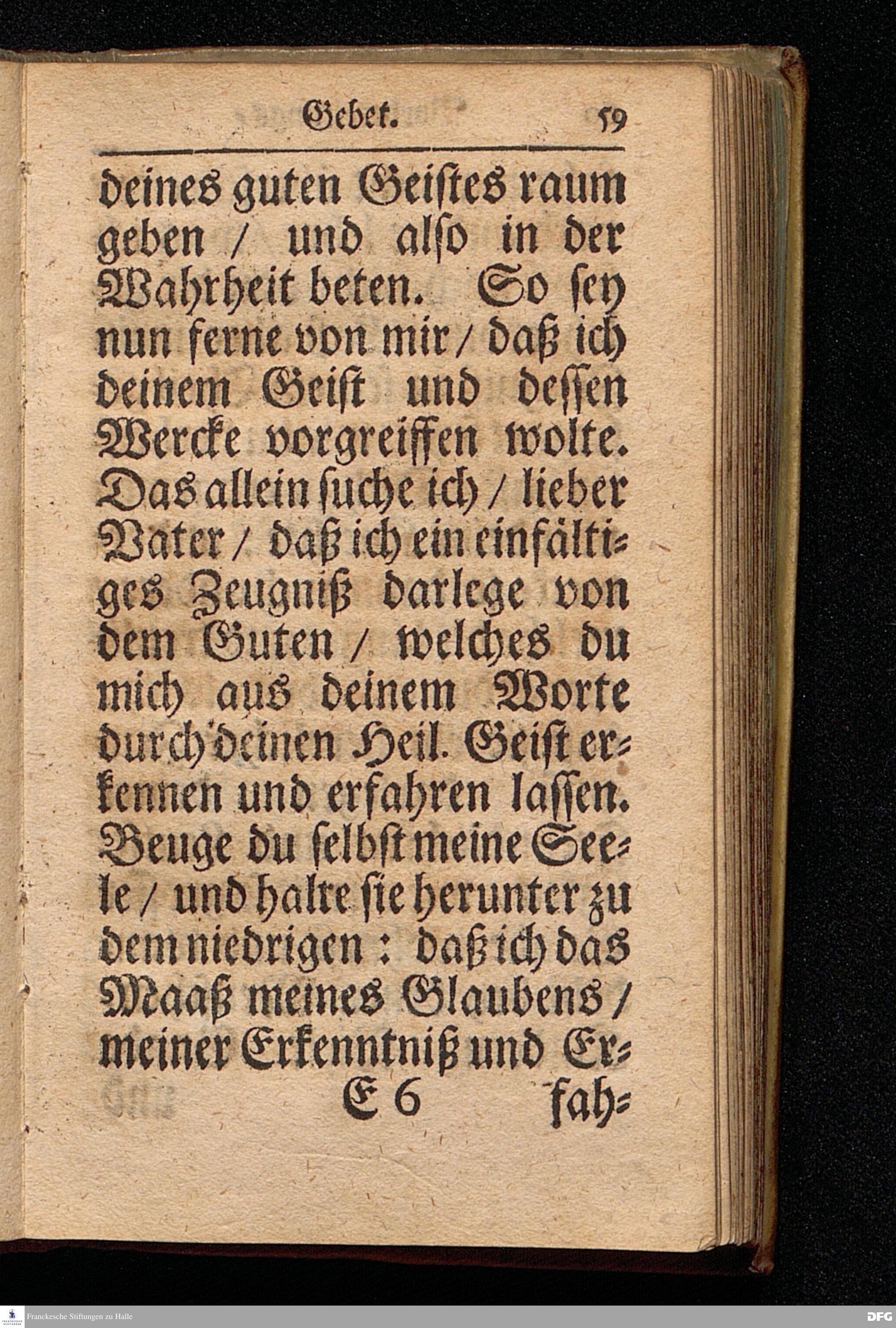 Aug.Herm.Franckens / S.S.Theol.P.Ord.& Past.Glauch. Schrifftmäßige Anweisung Recht und GOTT wohlgefällig Zu Beten / Nebst Einer Anfrage An die Hochlöbl.Theol.Facult. Zu KIEL Und deren RESPONSO, Die Gewißheit und Versicherung der Erhörung des Gebets betreffend. Andere EDITION. CUM PRIVILEGIO. HALLE /Gedruckt und verlegt im Wäysen=Hause. 1703.