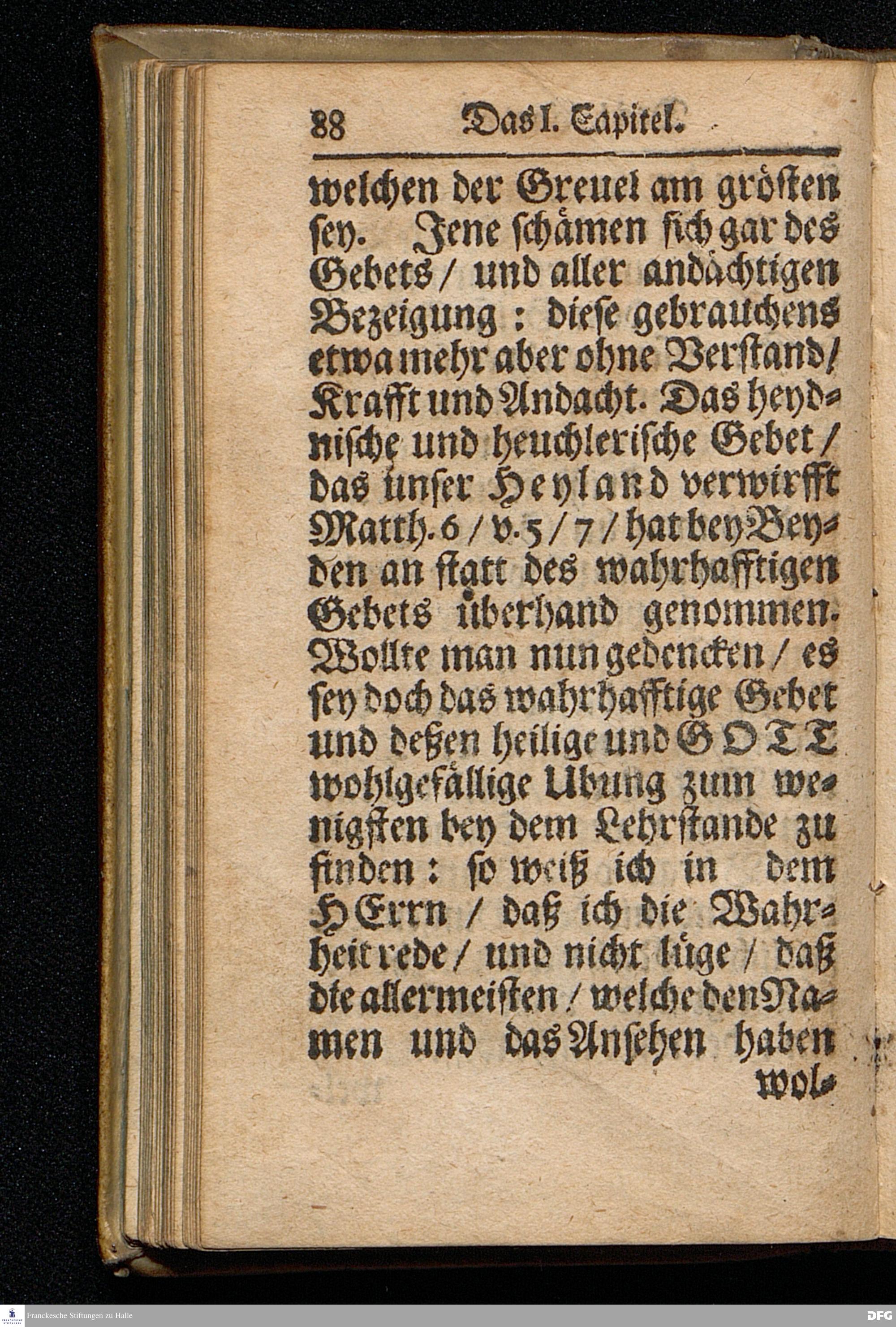 Aug.Herm.Franckens / S.S.Theol.P.Ord.& Past.Glauch. Schrifftmäßige Anweisung Recht und GOTT wohlgefällig Zu Beten / Nebst Einer Anfrage An die Hochlöbl.Theol.Facult. Zu KIEL Und deren RESPONSO, Die Gewißheit und Versicherung der Erhörung des Gebets betreffend. Andere EDITION. CUM PRIVILEGIO. HALLE /Gedruckt und verlegt im Wäysen=Hause. 1703.