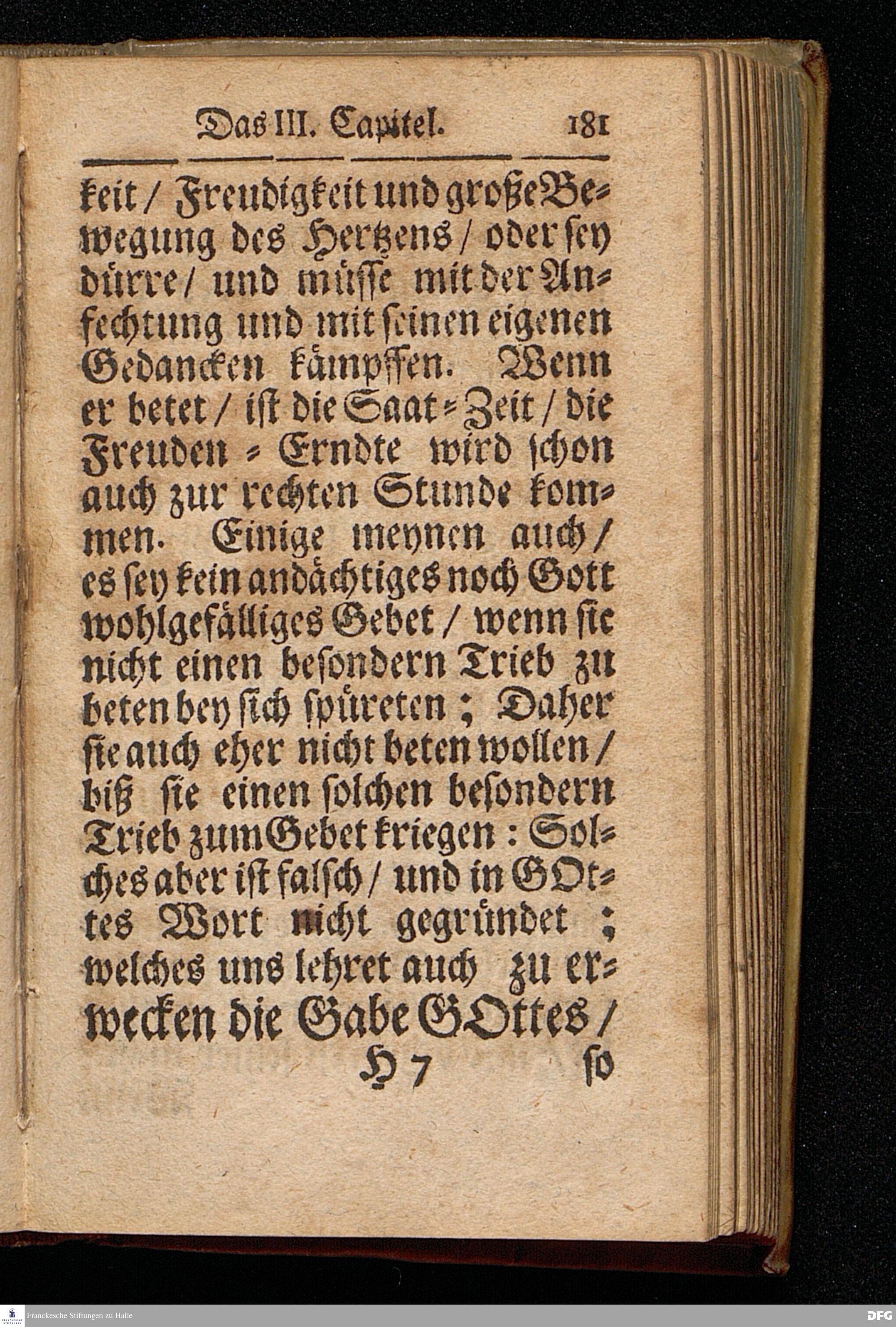Aug.Herm.Franckens / S.S.Theol.P.Ord.& Past.Glauch. Schrifftmäßige Anweisung Recht und GOTT wohlgefällig Zu Beten / Nebst Einer Anfrage An die Hochlöbl.Theol.Facult. Zu KIEL Und deren RESPONSO, Die Gewißheit und Versicherung der Erhörung des Gebets betreffend. Andere EDITION. CUM PRIVILEGIO. HALLE /Gedruckt und verlegt im Wäysen=Hause. 1703.