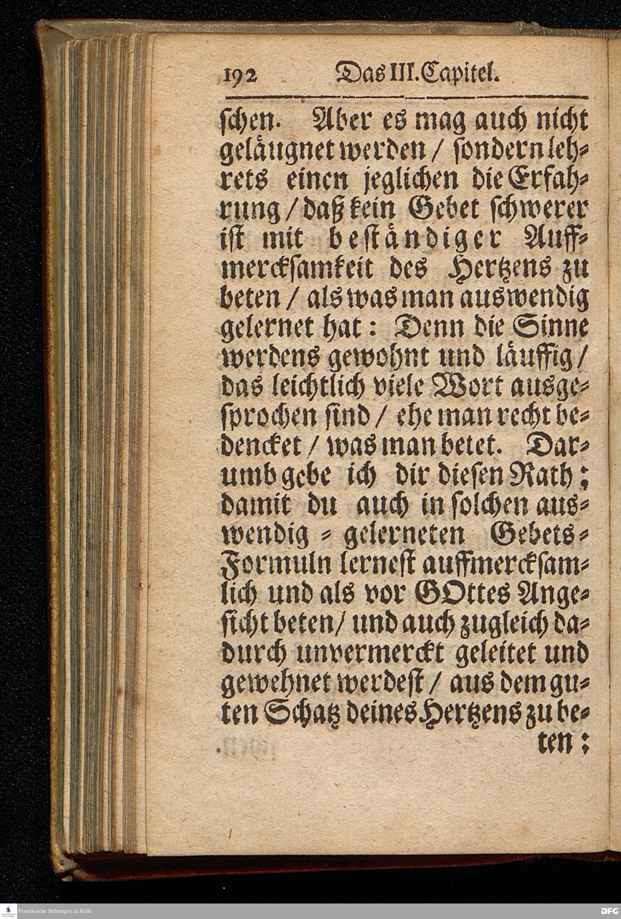Aug.Herm.Franckens / S.S.Theol.P.Ord.& Past.Glauch. Schrifftmäßige Anweisung Recht und GOTT wohlgefällig Zu Beten / Nebst Einer Anfrage An die Hochlöbl.Theol.Facult. Zu KIEL Und deren RESPONSO, Die Gewißheit und Versicherung der Erhörung des Gebets betreffend. Andere EDITION. CUM PRIVILEGIO. HALLE /Gedruckt und verlegt im Wäysen=Hause. 1703.