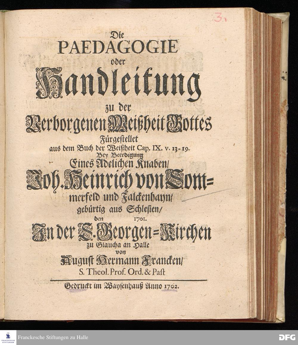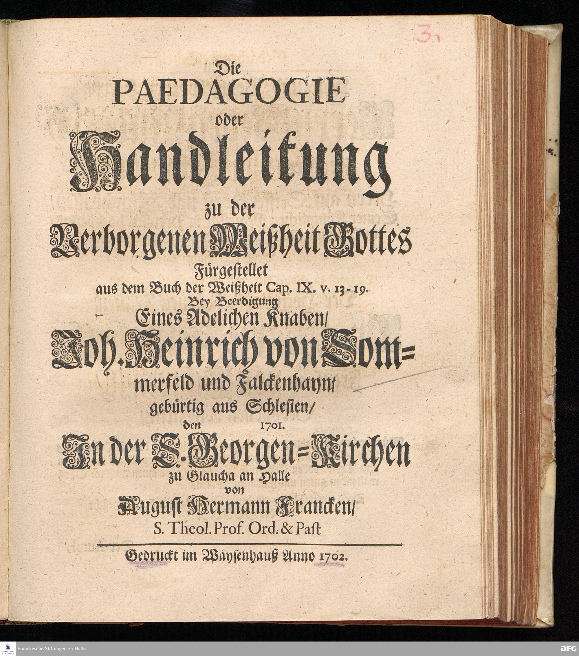 Die PAEDAGOGIE oder Handleitung zu der Verborgenen Weißheit Gottes Fürgestellet aus dem Buch der Weißheit Cap.IX. V.13-19. Bey Beerdigung Eines Adelichen Knaben / Joh.Heinrich von Sommerfeld und Falckenhayn / gebürtig aus Schlesien / den [Lücke] 1701. In der S.Georgen=Kirchen zu Glaucha an Halle von August Hermann Francken / S.Theol.Prof.Ord.& Past. Gedruckt im Waysen=Hause Anno 1702.