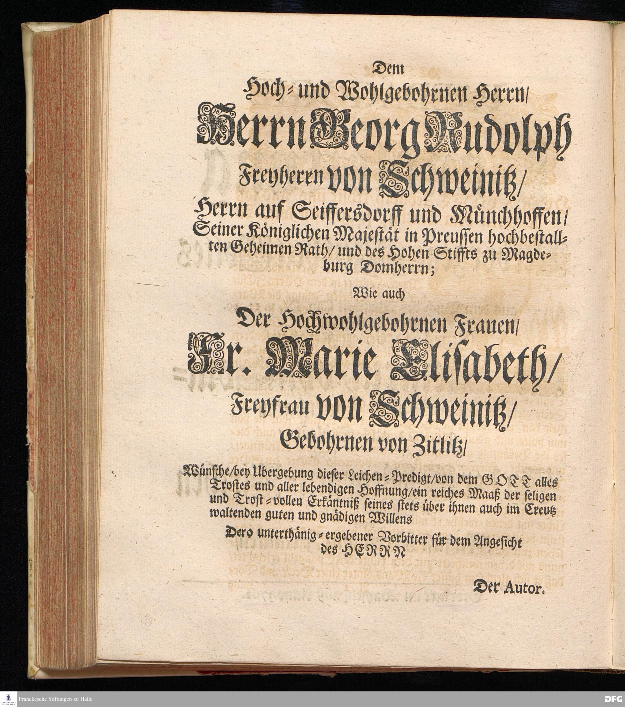 Die PAEDAGOGIE oder Handleitung zu der Verborgenen Weißheit Gottes Fürgestellet aus dem Buch der Weißheit Cap.IX. V.13-19. Bey Beerdigung Eines Adelichen Knaben / Joh.Heinrich von Sommerfeld und Falckenhayn / gebürtig aus Schlesien / den [Lücke] 1701. In der S.Georgen=Kirchen zu Glaucha an Halle von August Hermann Francken / S.Theol.Prof.Ord.& Past. Gedruckt im Waysen=Hause Anno 1702.