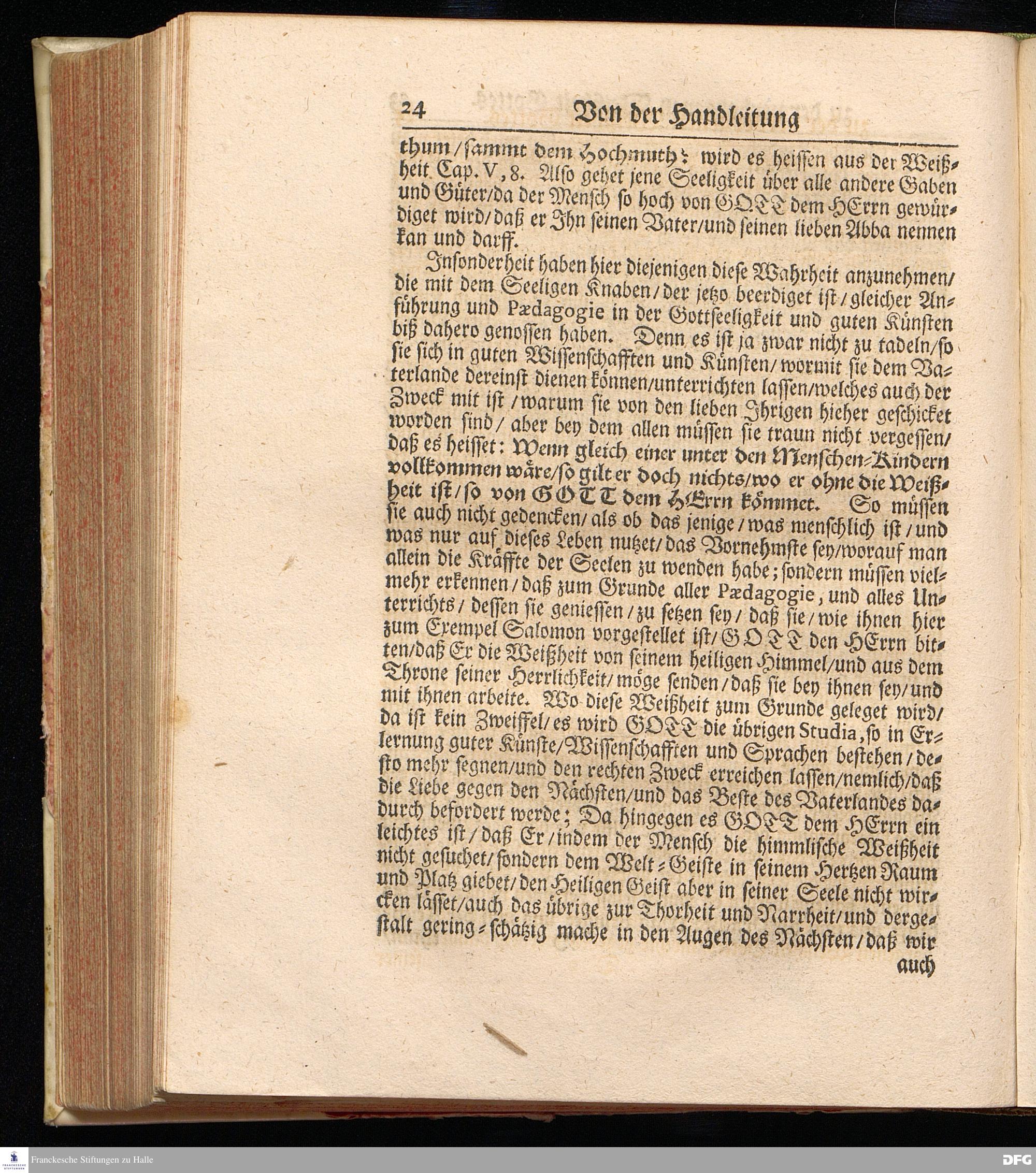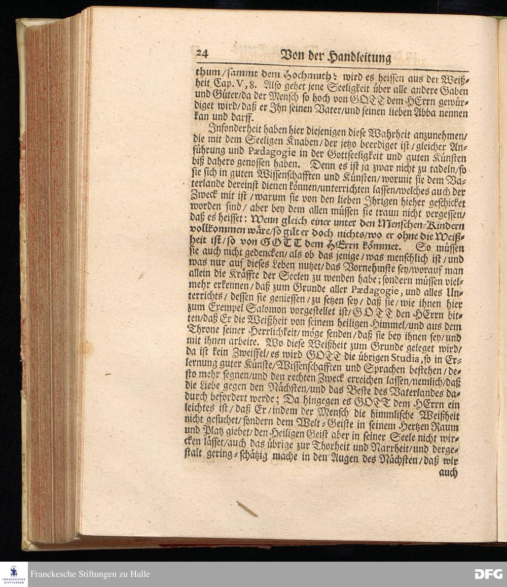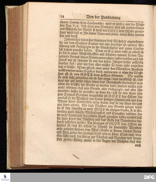 Die PAEDAGOGIE oder Handleitung zu der Verborgenen Weißheit Gottes Fürgestellet aus dem Buch der Weißheit Cap.IX. V.13-19. Bey Beerdigung Eines Adelichen Knaben / Joh.Heinrich von Sommerfeld und Falckenhayn / gebürtig aus Schlesien / den [Lücke] 1701. In der S.Georgen=Kirchen zu Glaucha an Halle von August Hermann Francken / S.Theol.Prof.Ord.& Past. Gedruckt im Waysen=Hause Anno 1702.