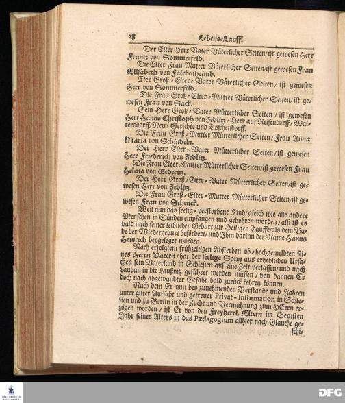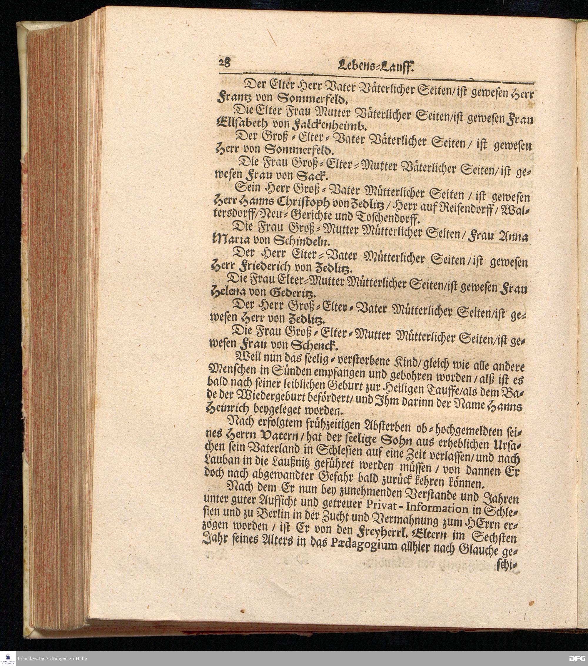 Die PAEDAGOGIE oder Handleitung zu der Verborgenen Weißheit Gottes Fürgestellet aus dem Buch der Weißheit Cap.IX. V.13-19. Bey Beerdigung Eines Adelichen Knaben / Joh.Heinrich von Sommerfeld und Falckenhayn / gebürtig aus Schlesien / den [Lücke] 1701. In der S.Georgen=Kirchen zu Glaucha an Halle von August Hermann Francken / S.Theol.Prof.Ord.& Past. Gedruckt im Waysen=Hause Anno 1702.