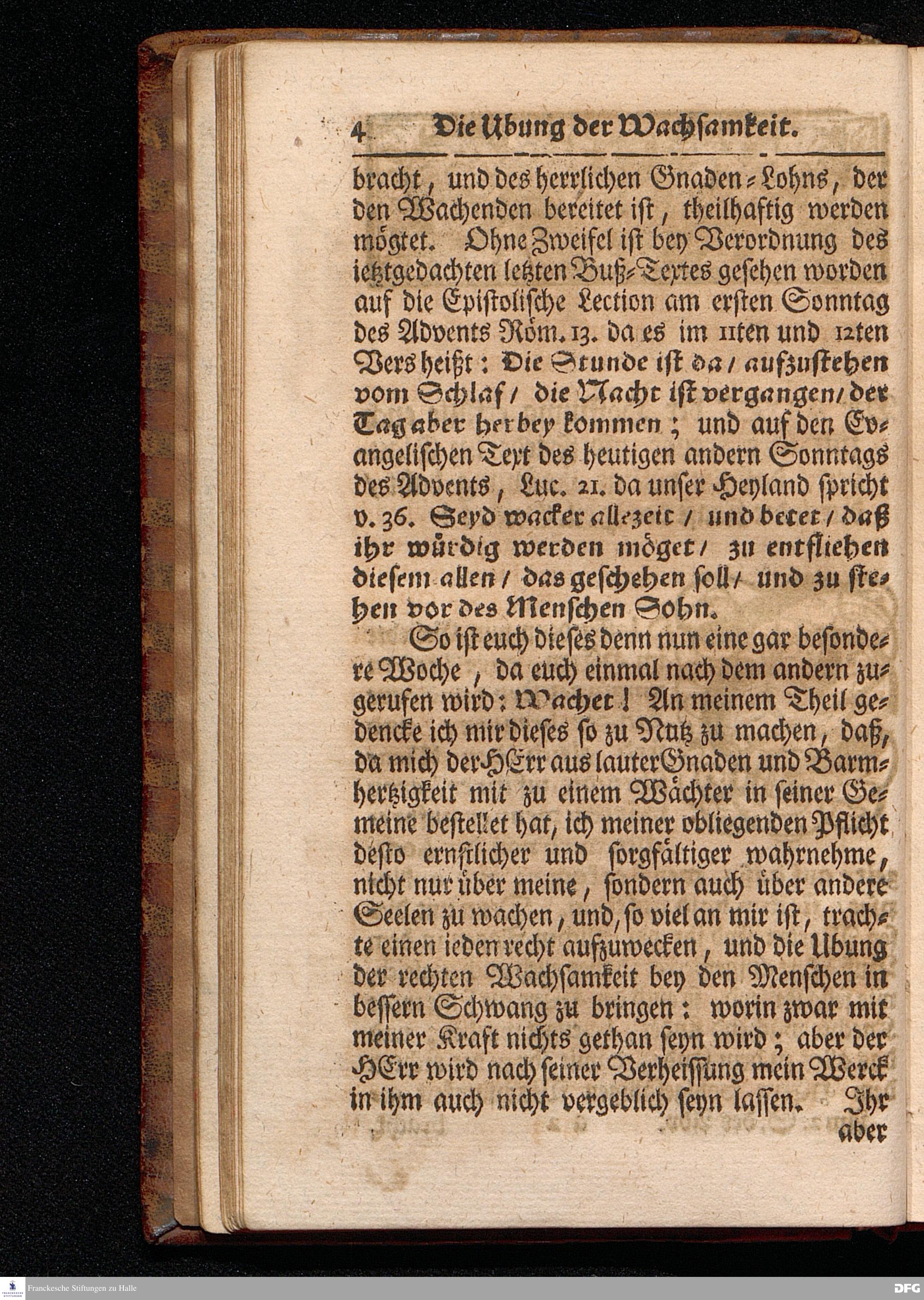 Die Ubung Der Wachsamkeit / Aus dem Evangelischen Text Luc.XXI, 25-36. Am II.Sonntage des Advents MDCCXVI. In der St.Ulrichs=Kirchen in Halle vorgestellet von August Hermann Francken / S.Theol.Prof.& Past.zu S.Ulrich, und des Gymnasii Scholarcha. HALLE, Gedruckt und zu finden im Wäysen=Hause, 1716.