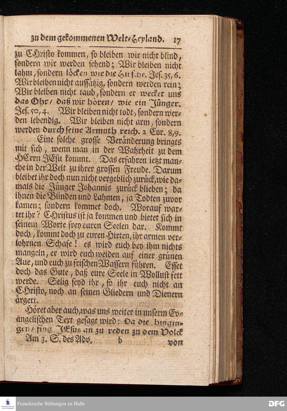 Aufweckender Zuruf, Zu kommen zu dem HErrn JEsu / Als zu dem / Der uns zu helfen in die Welt kommen ist / Aus dem Evangelischen Text Matth.XI, 2--10. Am II.Sonntage des Advents MDCCXVI. In der St.Ulrichs=Kirchen in Halle vorgestellet von August Hermann Francken / S.Theol.Prof.& Past.zu S.Ulrich, und des Gymnasii Scholarcha. HALLE, Gedruckt und zu finden im Wäysen=Hause. 1716.