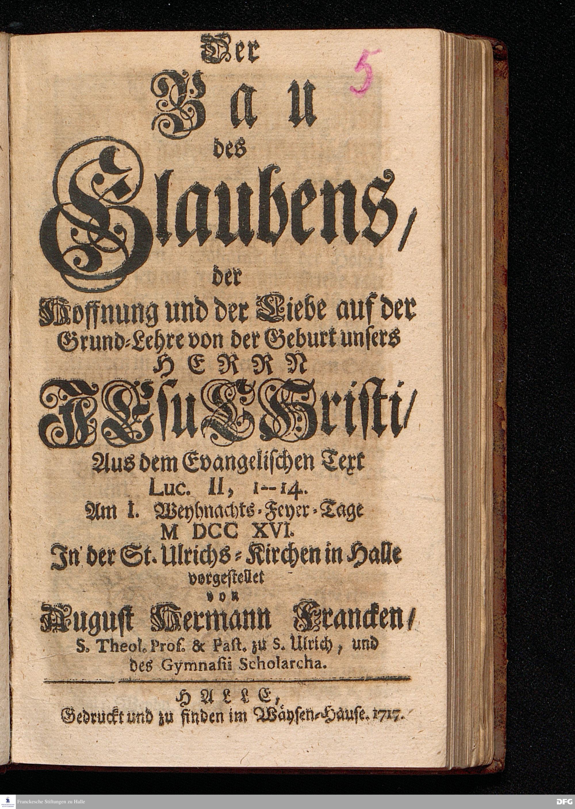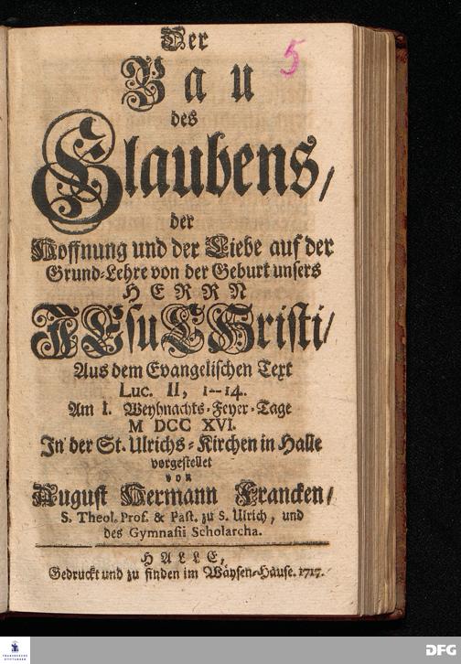 Der Bau des Glaubens / der Hoffnung und der Liebe auf der Grund=Lehre von der Geburt unsers HERRN JEsu CHristi / Aus dem Evangelischen Text Luc.II, 1--14. Am I.Weyhnachts=Feyer=Tage MDCCXVI. In der St.Ulrichs=Kirchen in Halle vorgestellet von August Hermann Francken / S.Theol.Prof.& Past.zu S.Ulrich, und des Gymnasii Scholarcha. HALLE, Gedruckt und zu finden im Wäysen=Hause. 1717.