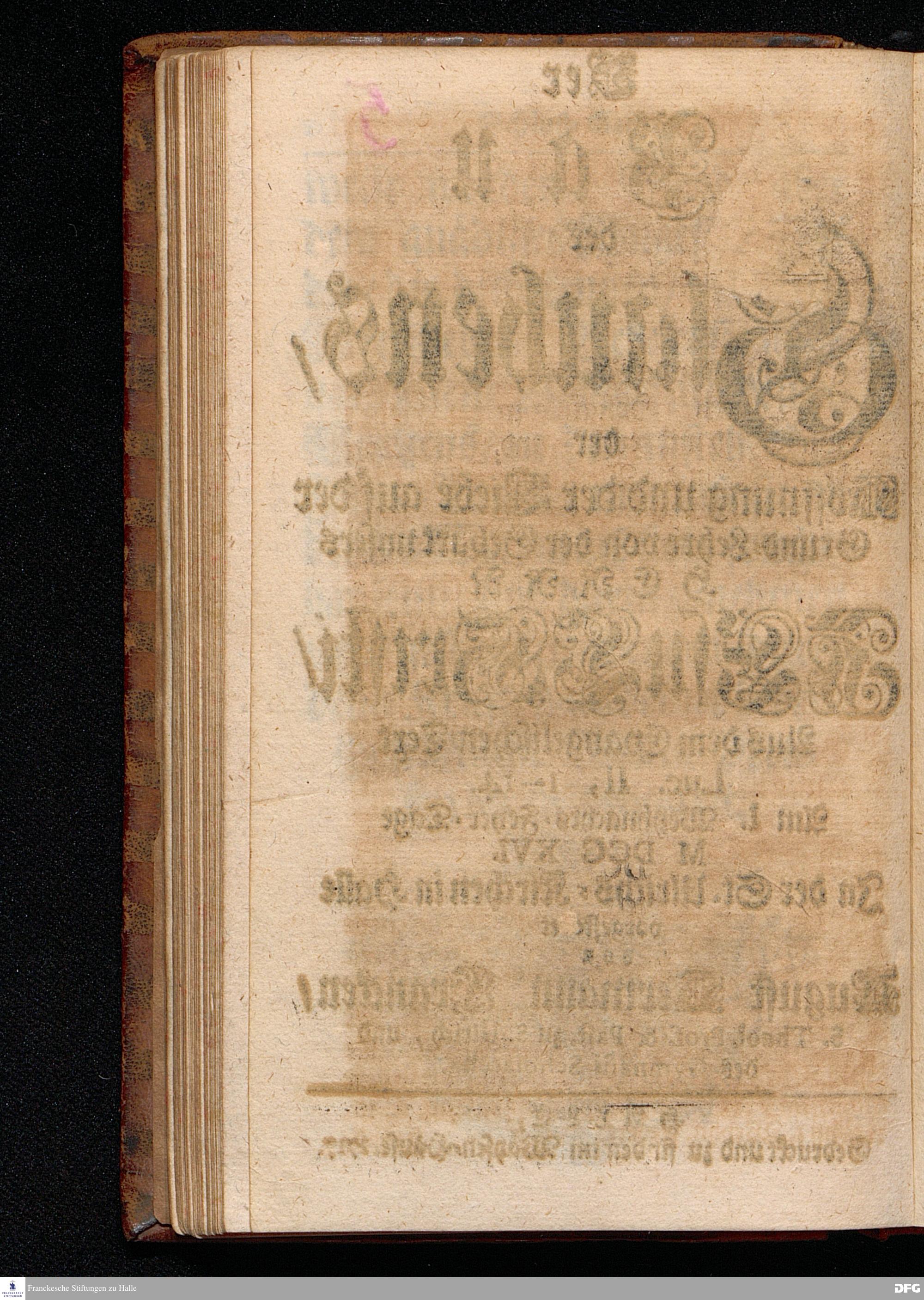 Der Bau des Glaubens / der Hoffnung und der Liebe auf der Grund=Lehre von der Geburt unsers HERRN JEsu CHristi / Aus dem Evangelischen Text Luc.II, 1--14. Am I.Weyhnachts=Feyer=Tage MDCCXVI. In der St.Ulrichs=Kirchen in Halle vorgestellet von August Hermann Francken / S.Theol.Prof.& Past.zu S.Ulrich, und des Gymnasii Scholarcha. HALLE, Gedruckt und zu finden im Wäysen=Hause. 1717.
