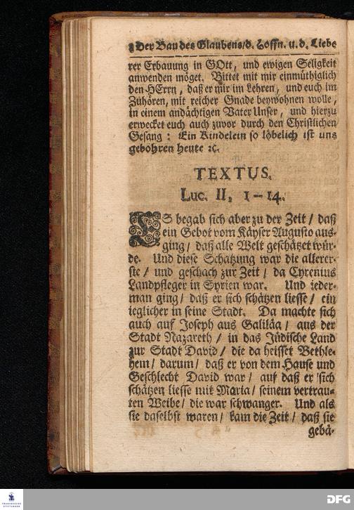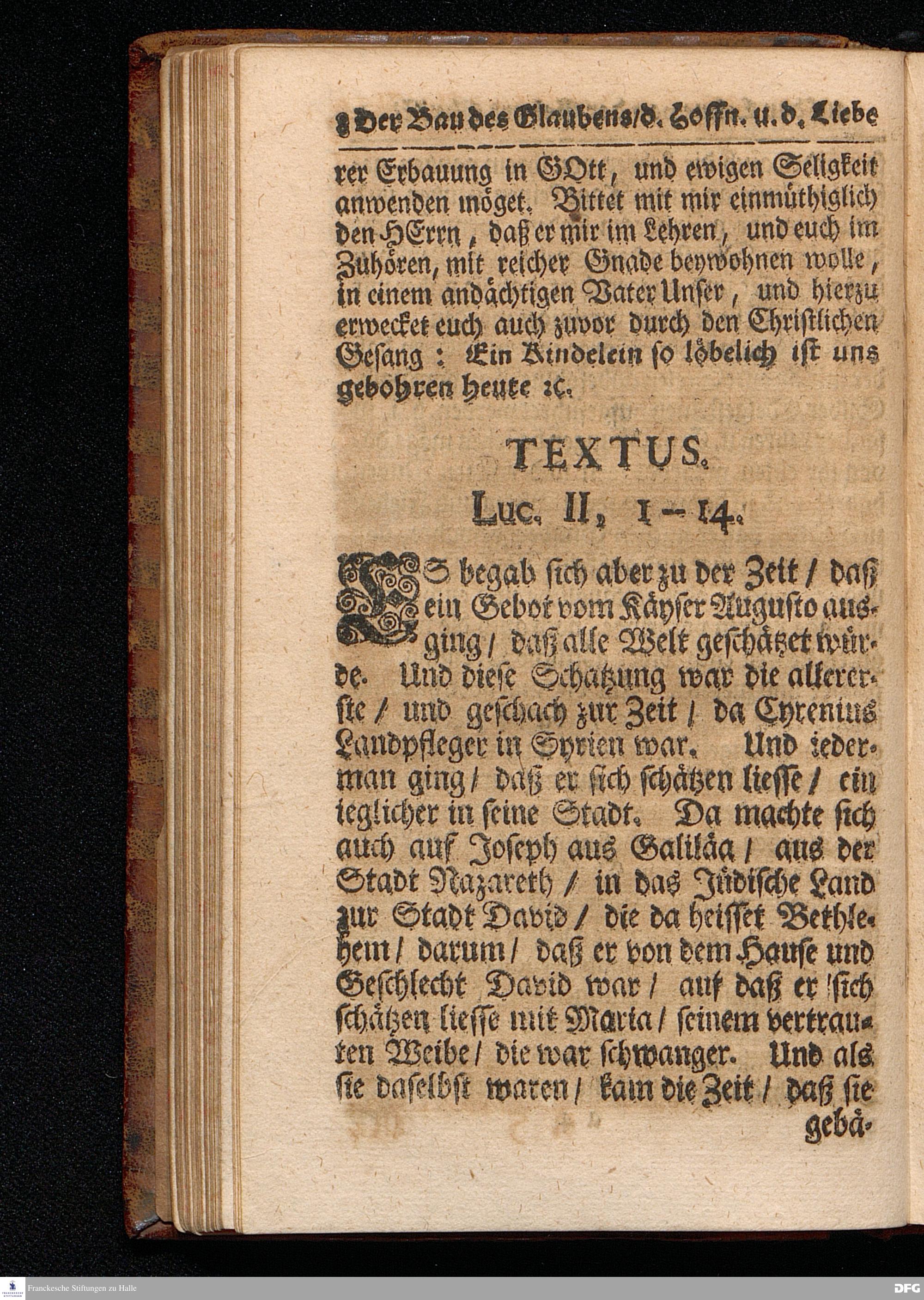 Der Bau des Glaubens / der Hoffnung und der Liebe auf der Grund=Lehre von der Geburt unsers HERRN JEsu CHristi / Aus dem Evangelischen Text Luc.II, 1--14. Am I.Weyhnachts=Feyer=Tage MDCCXVI. In der St.Ulrichs=Kirchen in Halle vorgestellet von August Hermann Francken / S.Theol.Prof.& Past.zu S.Ulrich, und des Gymnasii Scholarcha. HALLE, Gedruckt und zu finden im Wäysen=Hause. 1717.