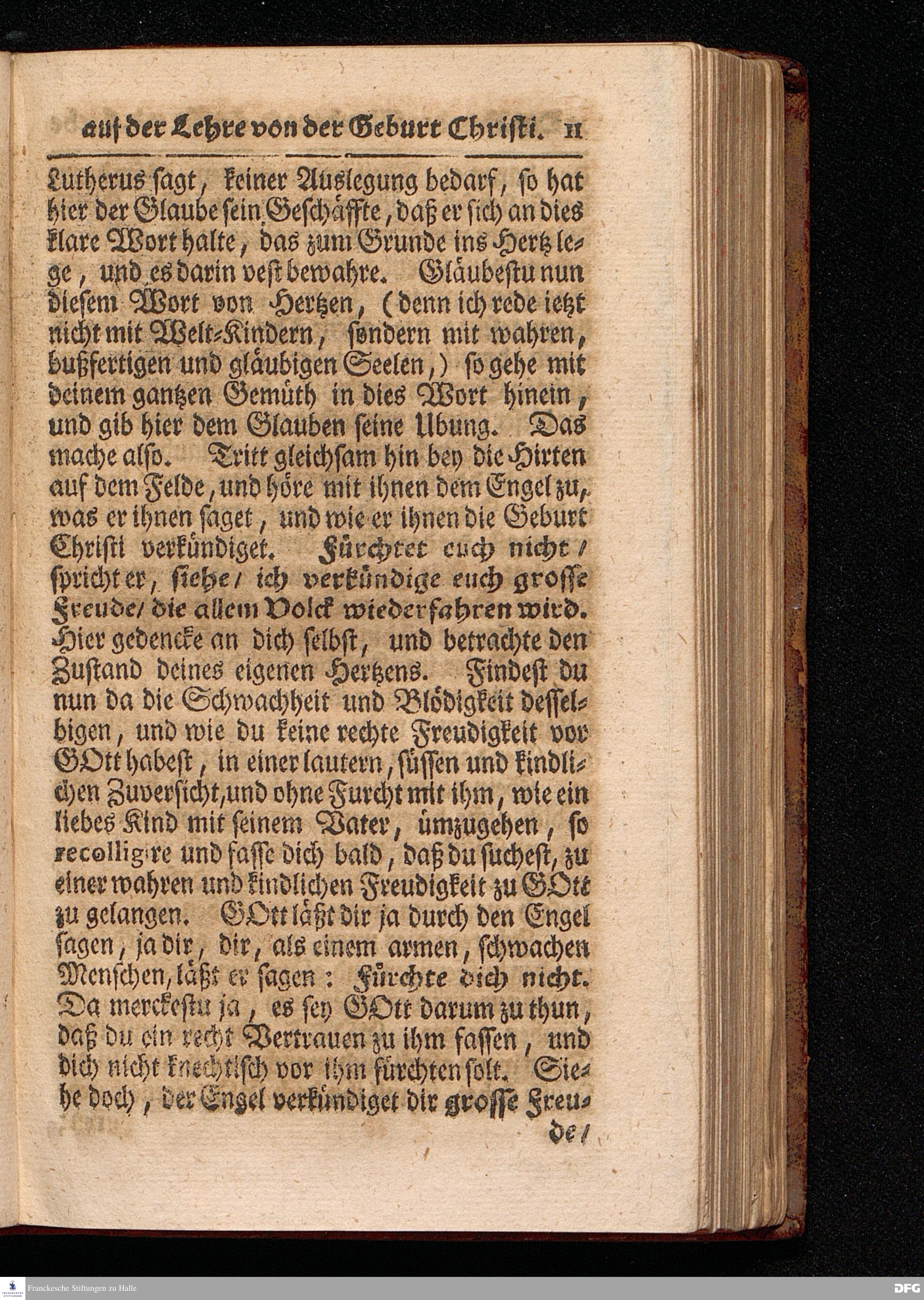 Der Bau des Glaubens / der Hoffnung und der Liebe auf der Grund=Lehre von der Geburt unsers HERRN JEsu CHristi / Aus dem Evangelischen Text Luc.II, 1--14. Am I.Weyhnachts=Feyer=Tage MDCCXVI. In der St.Ulrichs=Kirchen in Halle vorgestellet von August Hermann Francken / S.Theol.Prof.& Past.zu S.Ulrich, und des Gymnasii Scholarcha. HALLE, Gedruckt und zu finden im Wäysen=Hause. 1717.
