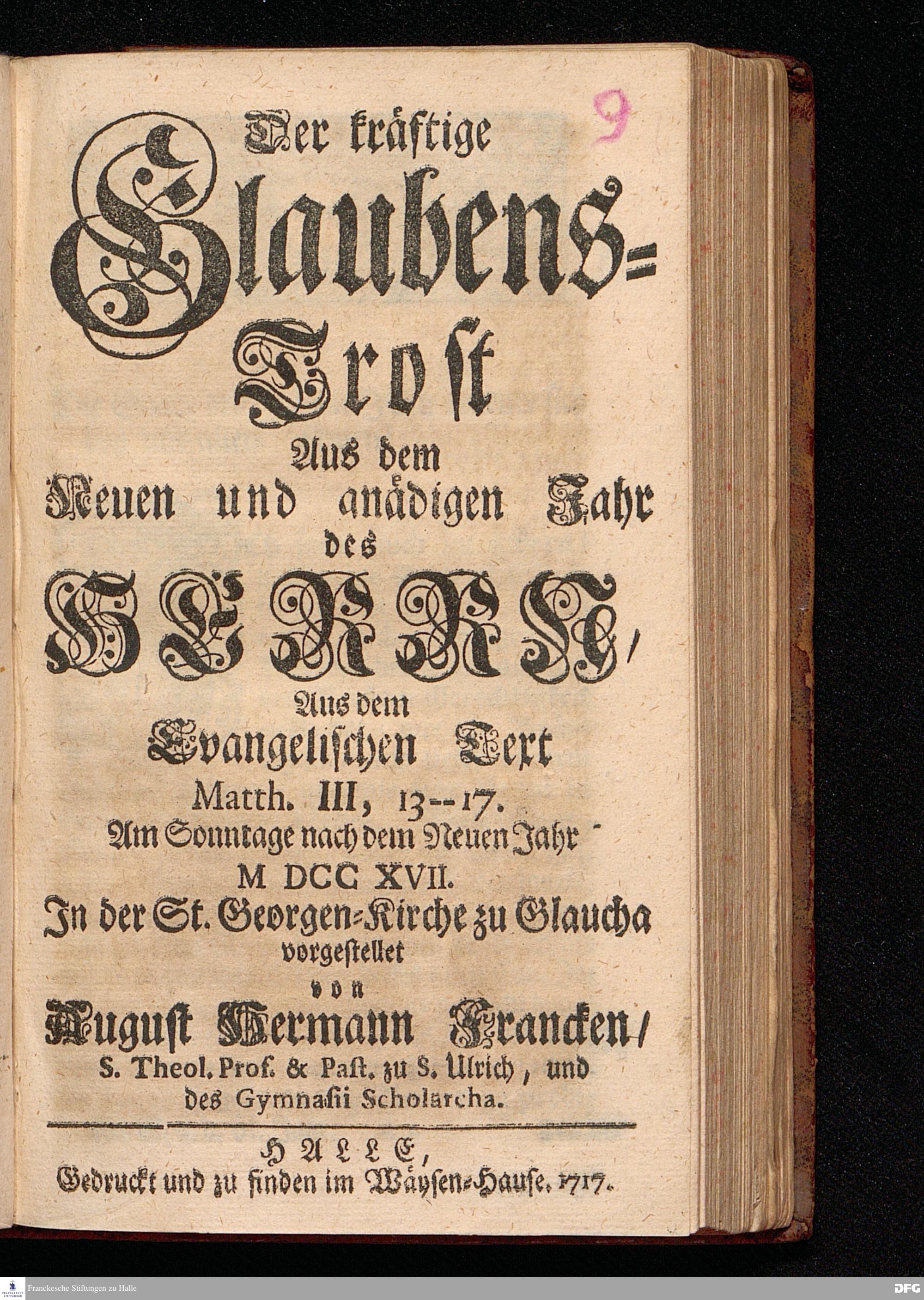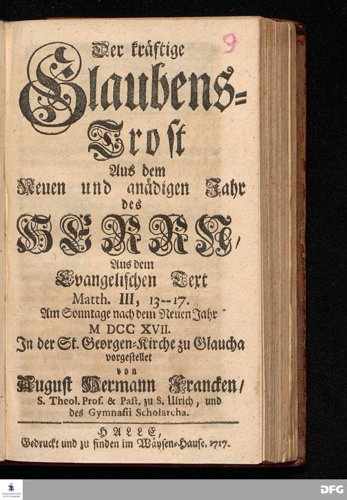 Der kräftige Glaubens=Trost Aus dem Neuen und gnädigen Jahr des HERRN / Aus dem Evangelischen Text Matth.III, 13--17. Am Sonntage nach dem Neuen Jahr MDCCXVII. In der St.Georgen=Kirche zu Glaucha vorgestellet von August Hermann Francken / S.Theol.Prof.& Past.zu S.Ulrich, und des Gymnasii Scholarcha. HALLE, Gedruckt und zu finden im Wäysen=Hause. 1717.