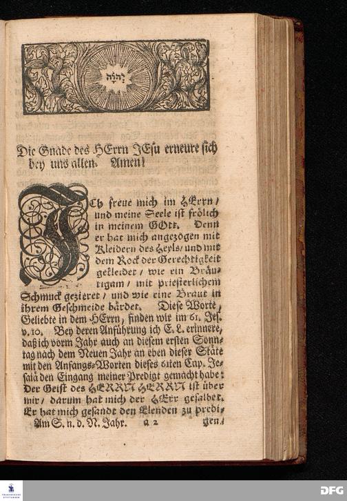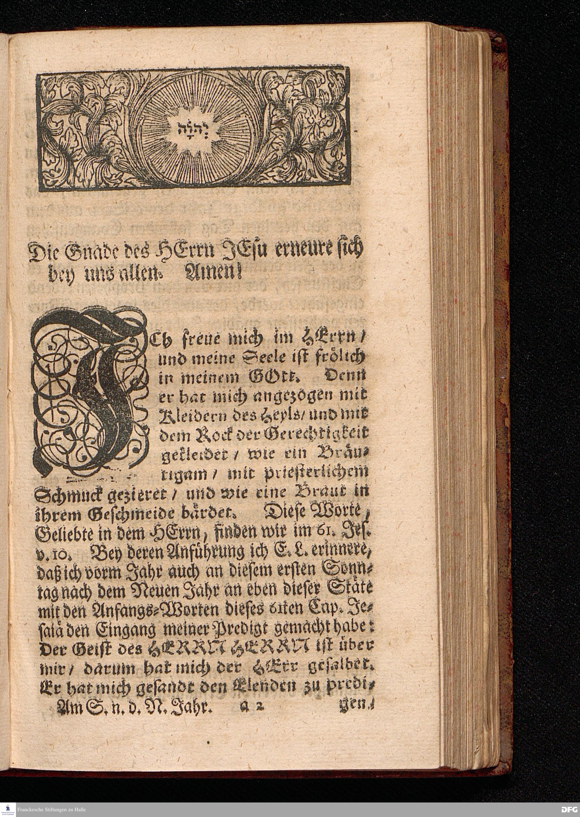 Der kräftige Glaubens=Trost Aus dem Neuen und gnädigen Jahr des HERRN / Aus dem Evangelischen Text Matth.III, 13--17. Am Sonntage nach dem Neuen Jahr MDCCXVII. In der St.Georgen=Kirche zu Glaucha vorgestellet von August Hermann Francken / S.Theol.Prof.& Past.zu S.Ulrich, und des Gymnasii Scholarcha. HALLE, Gedruckt und zu finden im Wäysen=Hause. 1717.
