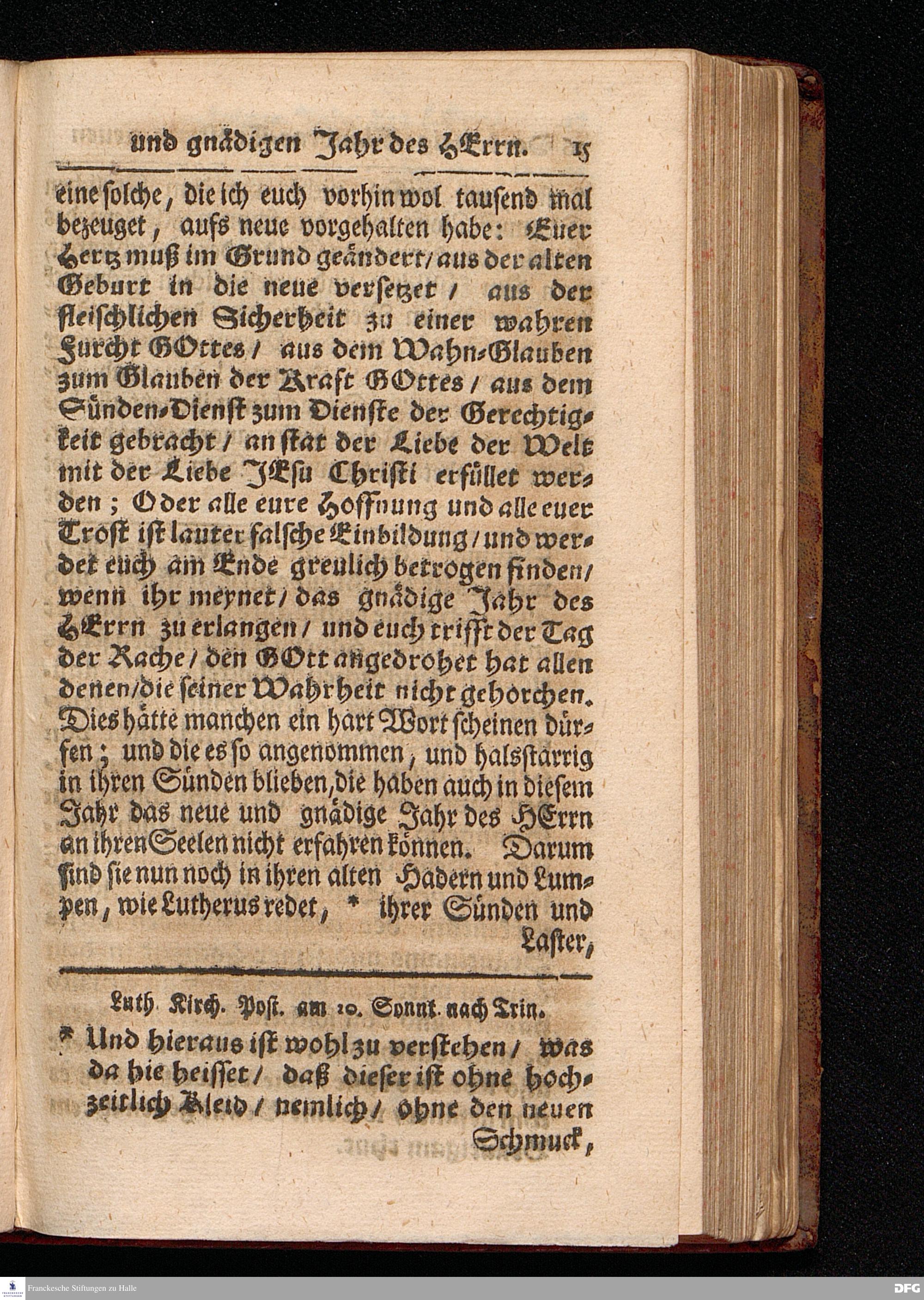 Der kräftige Glaubens=Trost Aus dem Neuen und gnädigen Jahr des HERRN / Aus dem Evangelischen Text Matth.III, 13--17. Am Sonntage nach dem Neuen Jahr MDCCXVII. In der St.Georgen=Kirche zu Glaucha vorgestellet von August Hermann Francken / S.Theol.Prof.& Past.zu S.Ulrich, und des Gymnasii Scholarcha. HALLE, Gedruckt und zu finden im Wäysen=Hause. 1717.
