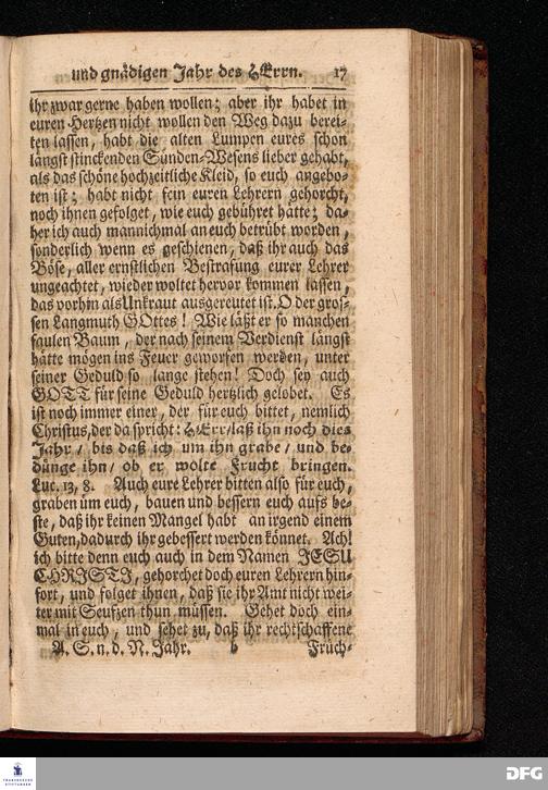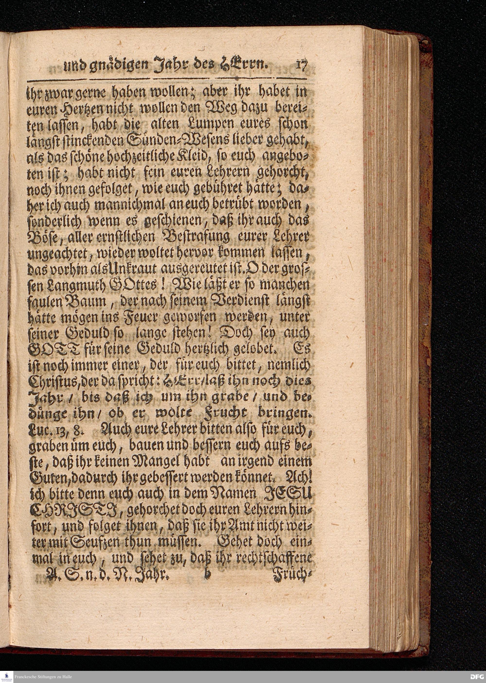 Der kräftige Glaubens=Trost Aus dem Neuen und gnädigen Jahr des HERRN / Aus dem Evangelischen Text Matth.III, 13--17. Am Sonntage nach dem Neuen Jahr MDCCXVII. In der St.Georgen=Kirche zu Glaucha vorgestellet von August Hermann Francken / S.Theol.Prof.& Past.zu S.Ulrich, und des Gymnasii Scholarcha. HALLE, Gedruckt und zu finden im Wäysen=Hause. 1717.