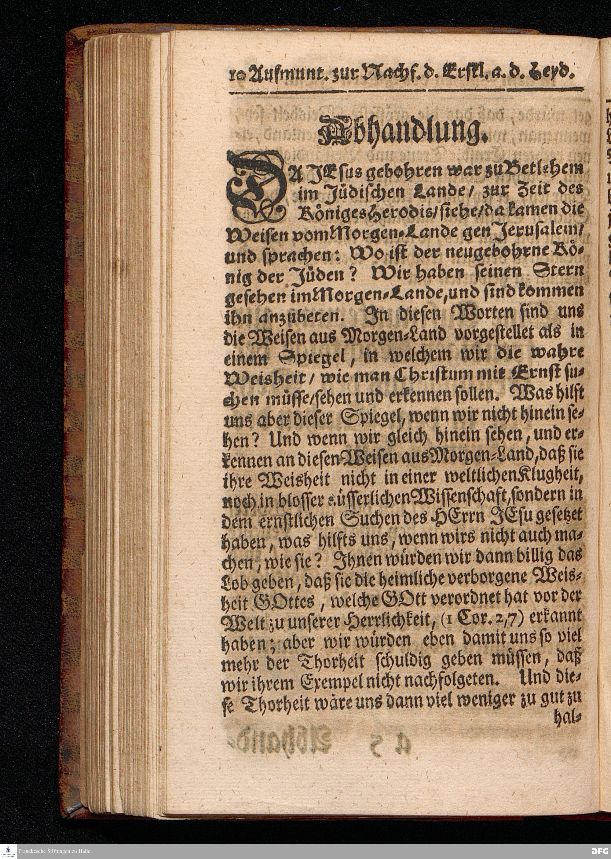 Aufmunterung zur freudigen Nachfolge der Erstlinge aus den Heyden in dem Suchen des HErrn JEsu / Aus dem Evangelischen Text Matth.II, 1--12. Am Fest der Heil.Drey Könige MDCCXVII. In der St.Ulrichs=Kirchen in Halle vorgestellet von August Hermann Francken / S.Theol.Prof.& Past. zu S.Ulrich, und des Gymnasii Scholarcha. HALLE, Gedruckt und zu finden im Wäysen=Hause. 1717.