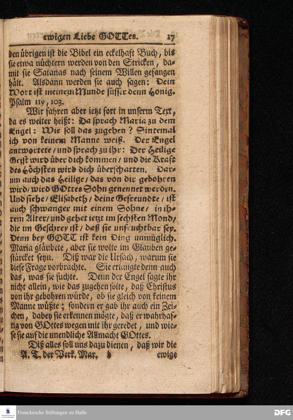 Die Beschauung der Geoffenbarten ewigen Liebe GOttes / Aus dem Evangelischen Text Luc.I, 26--38. Am Tage der Verkündigung Mariä MDCCXVII. In der St.Ulrichs=Kirchen in Halle vorgestellet von August Hermann Francken / S.Theol.Prof.& Past.zu S.Ulrich, und des Gymnasii Scholarcha. HALLE, Gedruckt und zu finden im Wäysen=Hause, 1717.