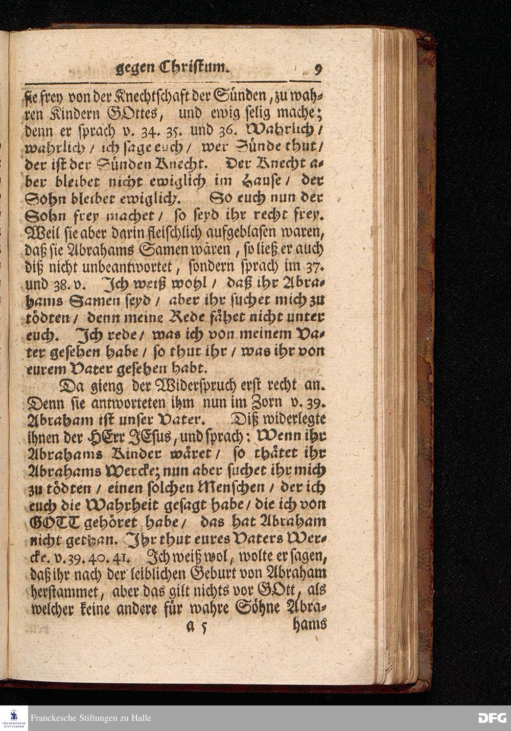 Der Widerspruch der Sünder gegen CHristum / Als er ihnen die Freyheit seiner Gläubigen von der Sünde und vom Tode verkündigte / Aus dem Evangelischen Text Ioh.VIII, 46--59. Am Sonntage Judica MDCCXVII. In der St.Ulrichs=Kirchen in Halle vorgestellet von August Hermann Francken / S.Theol.Prof.& Past.zu S.Ulrich, und des Gymnasii Scholarcha. HALLE, Gedruckt und zu finden im Waysen=Hause, 1717.