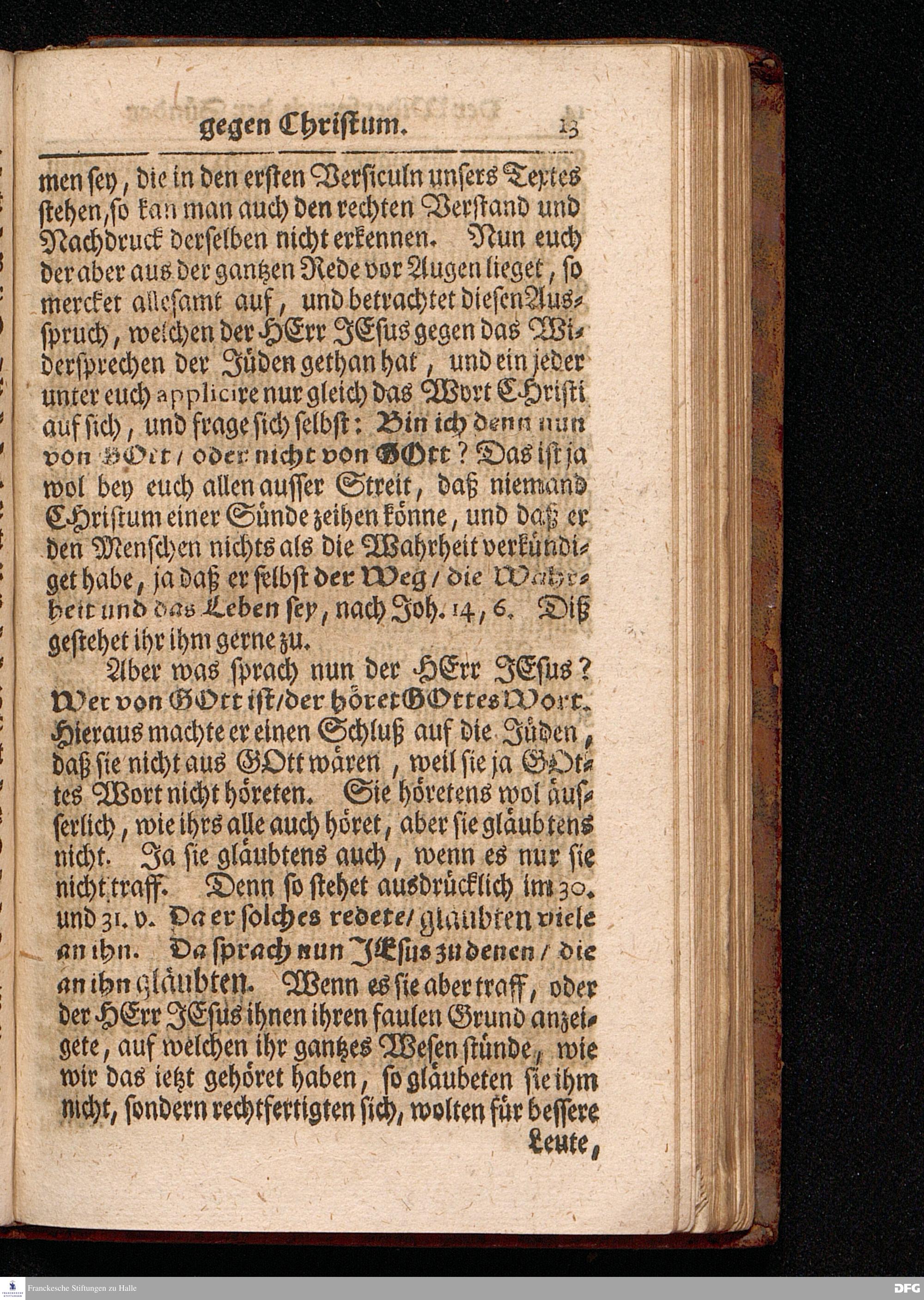 Der Widerspruch der Sünder gegen CHristum / Als er ihnen die Freyheit seiner Gläubigen von der Sünde und vom Tode verkündigte / Aus dem Evangelischen Text Ioh.VIII, 46--59. Am Sonntage Judica MDCCXVII. In der St.Ulrichs=Kirchen in Halle vorgestellet von August Hermann Francken / S.Theol.Prof.& Past.zu S.Ulrich, und des Gymnasii Scholarcha. HALLE, Gedruckt und zu finden im Waysen=Hause, 1717.