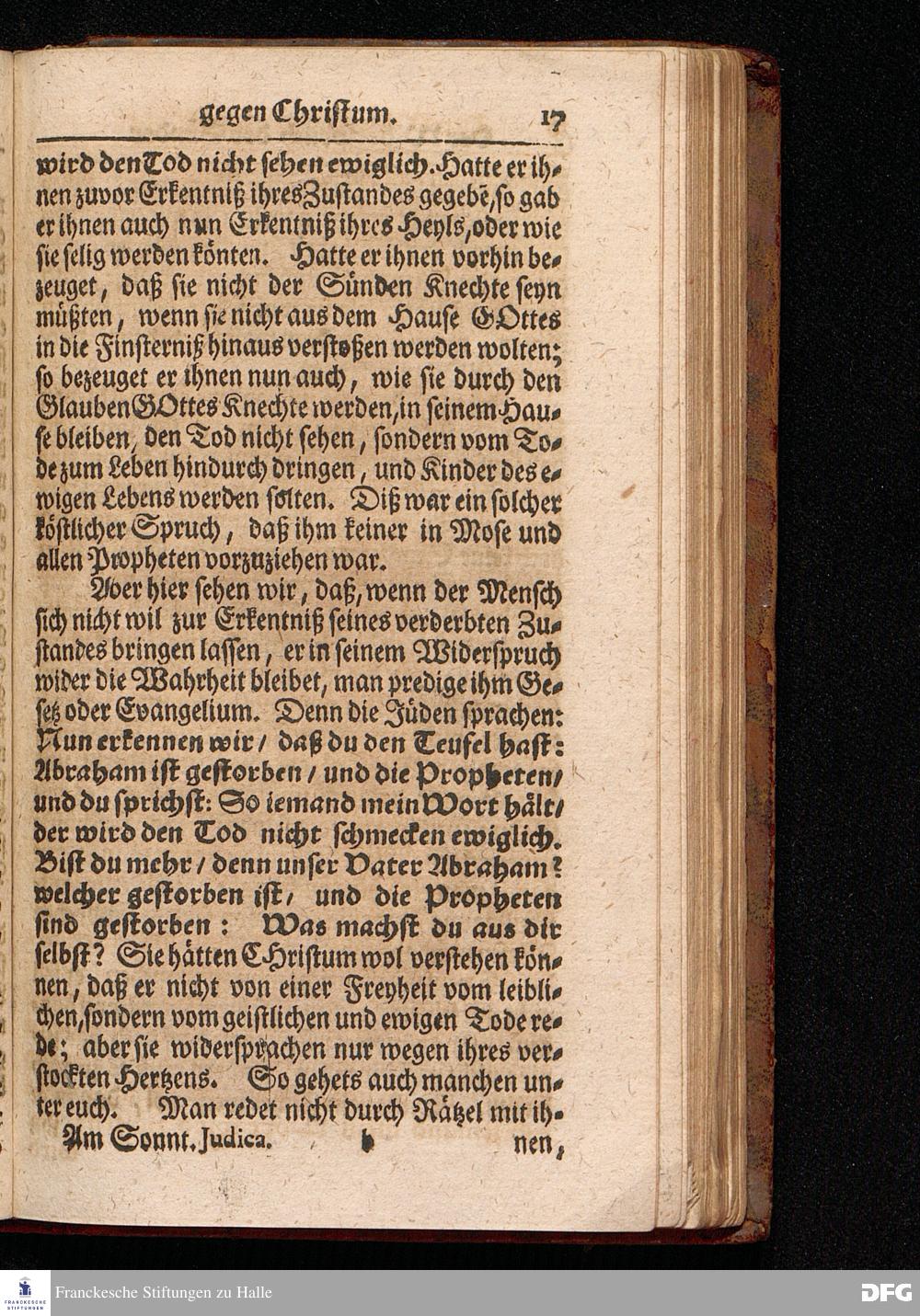 Der Widerspruch der Sünder gegen CHristum / Als er ihnen die Freyheit seiner Gläubigen von der Sünde und vom Tode verkündigte / Aus dem Evangelischen Text Ioh.VIII, 46--59. Am Sonntage Judica MDCCXVII. In der St.Ulrichs=Kirchen in Halle vorgestellet von August Hermann Francken / S.Theol.Prof.& Past.zu S.Ulrich, und des Gymnasii Scholarcha. HALLE, Gedruckt und zu finden im Waysen=Hause, 1717.