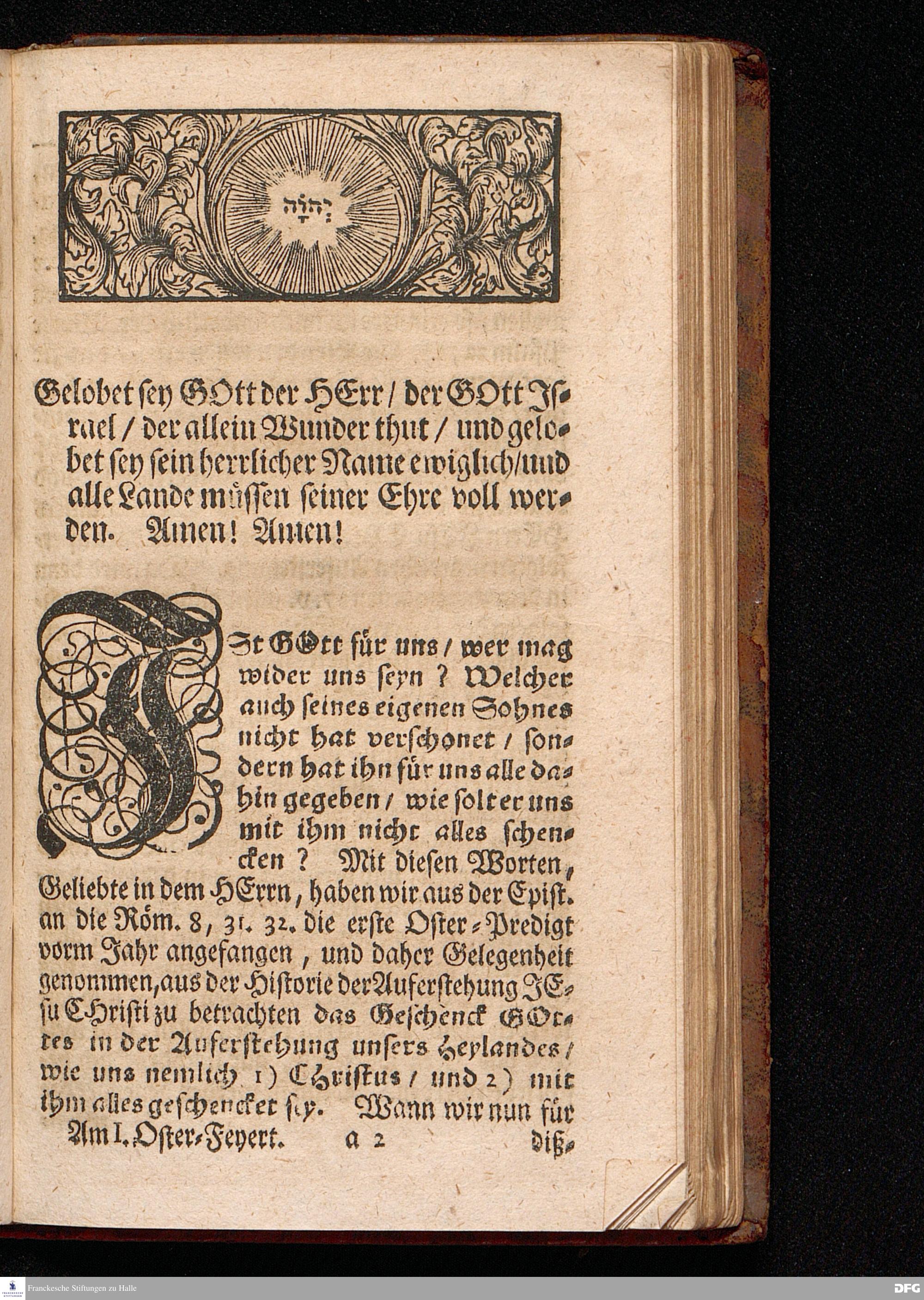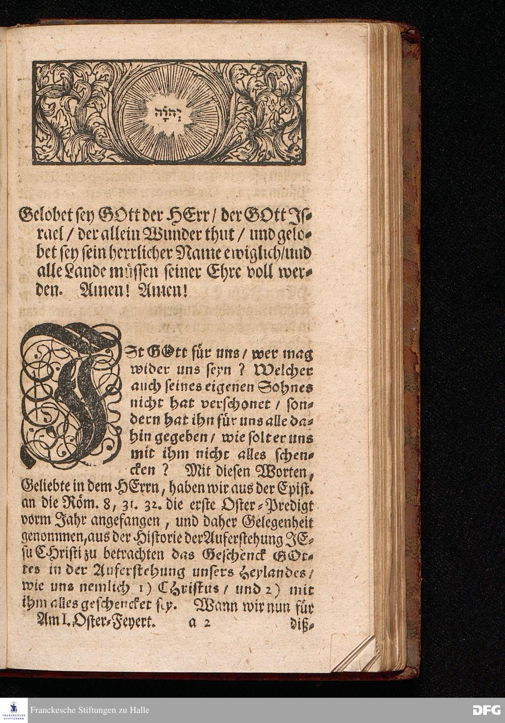 Der Kampf und Sieg des Glaubens Uber dem Geschenck GOttes in der Auferstehung JESU CHRISTI / Aus dem Anfang der Historie der Auferstehung JESU CHRISTI nach allen 4.Evangelisten Am Ersten Oster=Feyertage MDCCXVII. In der St.Ulrichs=Kirchen in Halle vorgestellet von August Hermann Francken / S.Theol.Prof.& Past.zu S.Ulrich, und des Gymnasii Scholarcha. HALLE, Gedruckt und zu finden im Wäysen=Hause, 1717.