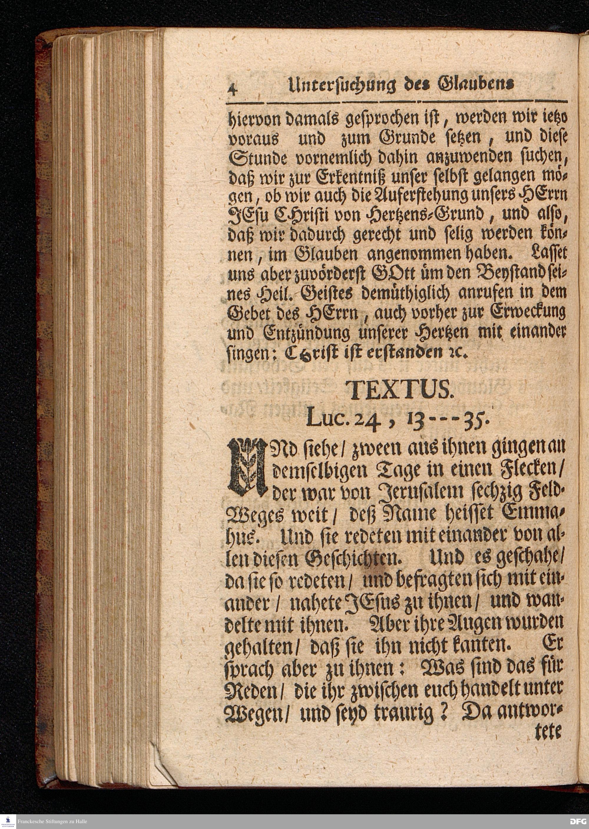 Die Untersuchung des Glaubens an den auferstandenen JESUM / Aus dem Evangelischen Text Luc.XXIV, 13--35. Am II.Oster=Feyertage MDCCXVII. In der St.Ulrichs=Kirchen in Halle vorgestellet von August Hermann Francken / S.Theol.Prof.& Past.zu S.Ulrich, und des Gymnasii Scholarcha. HALLE, Gedruckt und zu finden im Wäysen=Hause, 1717.