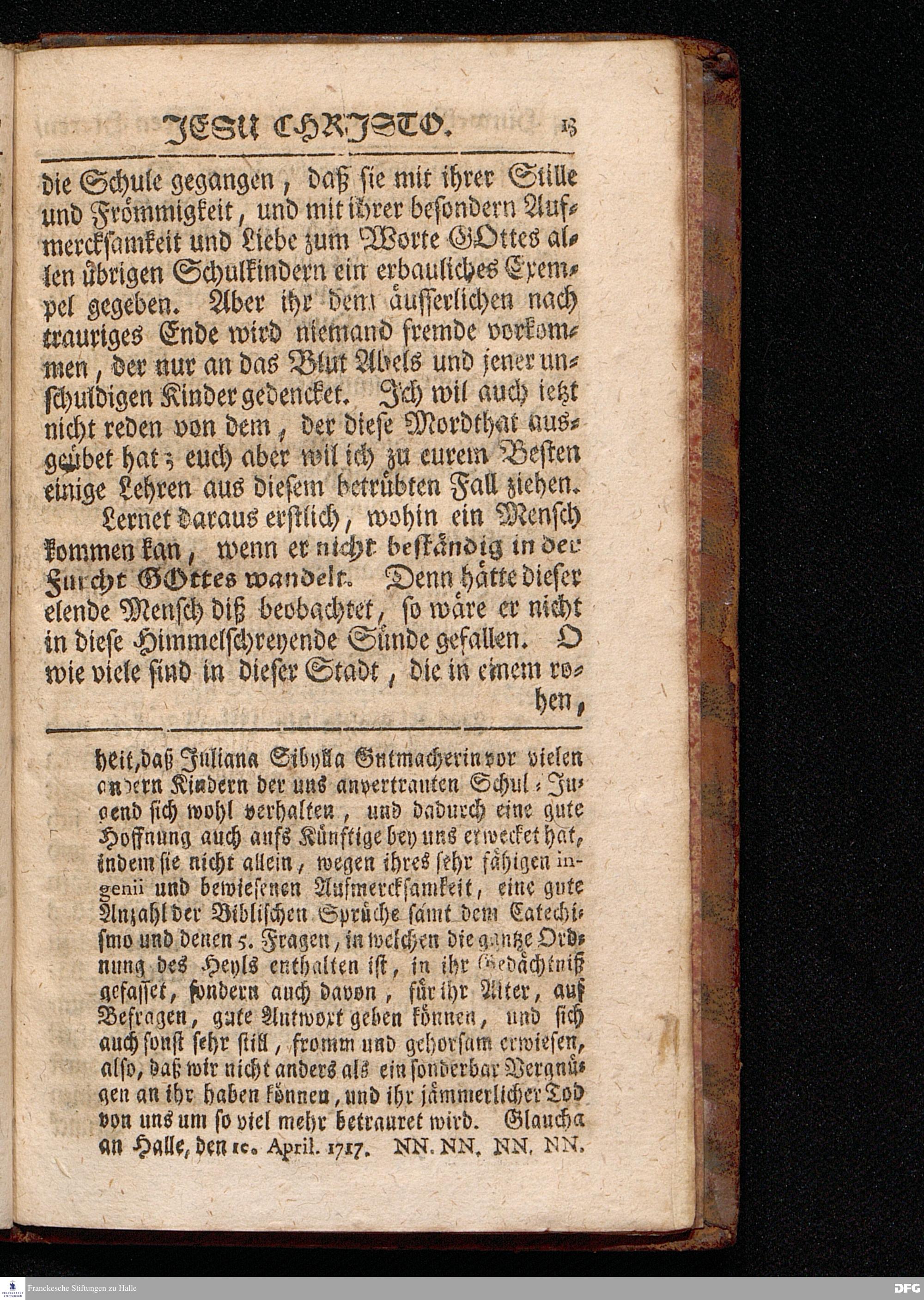 Die Hinweisung zu dem Einigen guten Hirten / JEsu CHristo / Aus dem Evangelischen Text Joh.X, 12--16. Am Sonntage Misericordias Domini MDCCXVII. In der St.Ulrichs=Kirchen in Halle vorgestellet von August Hermann Francken / S.Theol.Prof.& Past.zu S.Ulrich, und des Gymnasii Scholarcha. HALLE, Gedruckt und zu finden im Wäysen=Hause, 1717.