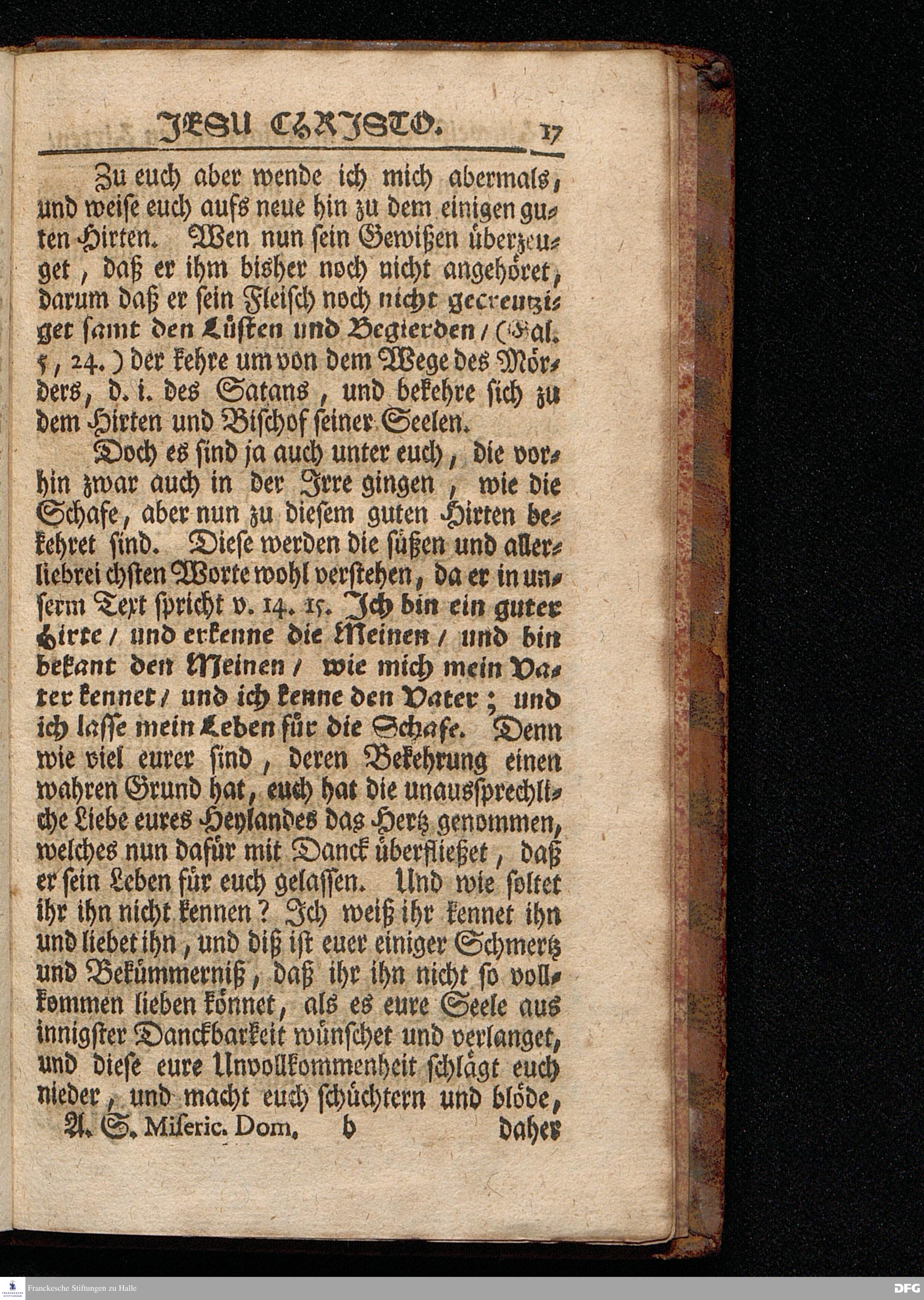 Die Hinweisung zu dem Einigen guten Hirten / JEsu CHristo / Aus dem Evangelischen Text Joh.X, 12--16. Am Sonntage Misericordias Domini MDCCXVII. In der St.Ulrichs=Kirchen in Halle vorgestellet von August Hermann Francken / S.Theol.Prof.& Past.zu S.Ulrich, und des Gymnasii Scholarcha. HALLE, Gedruckt und zu finden im Wäysen=Hause, 1717.